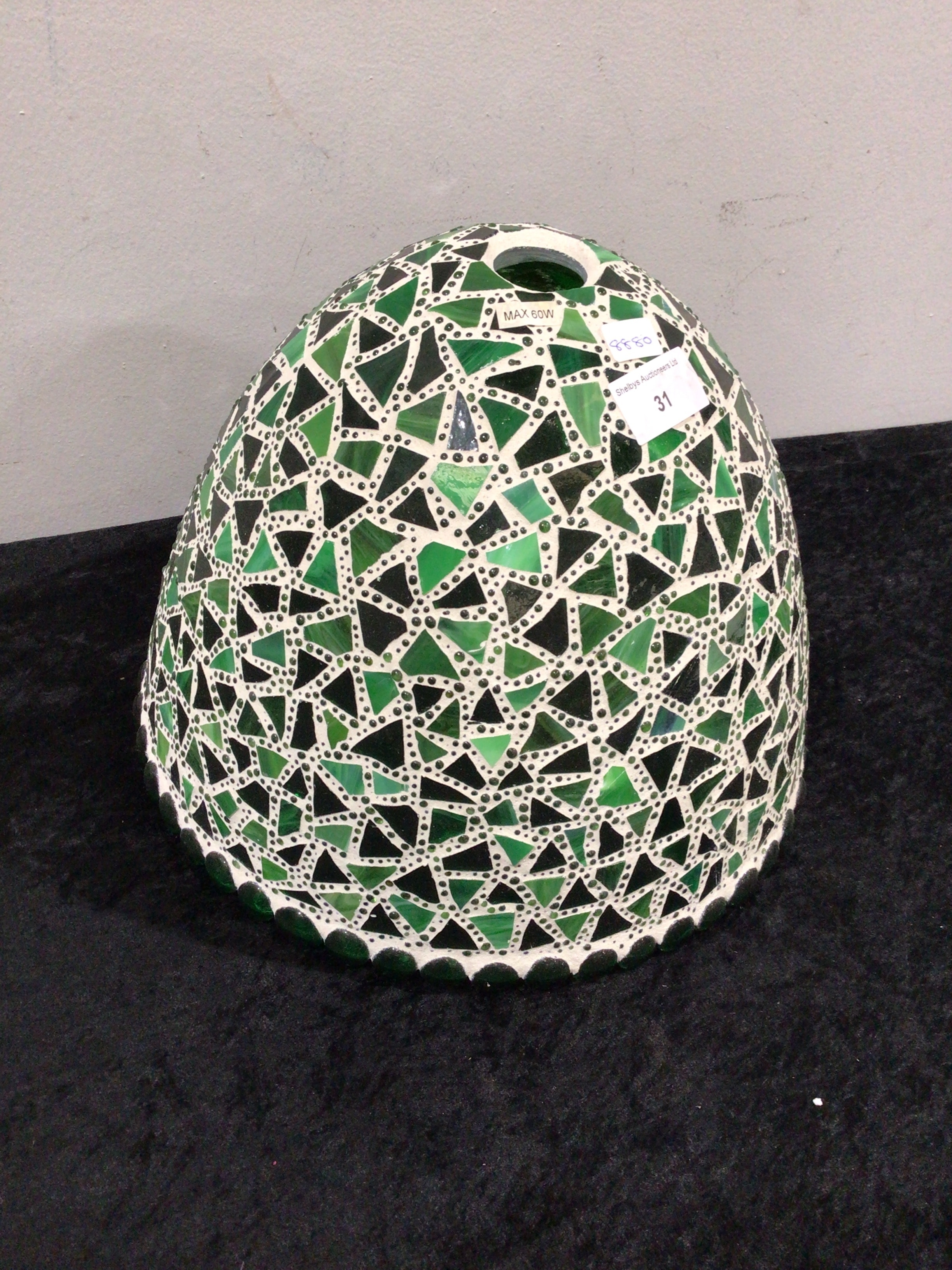 A modern Tiffany style mosaic glass pendant light shade, crafted in a domed, inverted bowl-shaped form. The exterior and interior are adorned with a mosaic pattern of predominantly green and black triangular glass tesserae set in white grout. It features a scalloped lower edge and a central circular opening at the apex. A white sticker on the exterior indicates “MAX 60W,” and another sticker bears “BEDFORD District Auctioneering” and the number “31.”