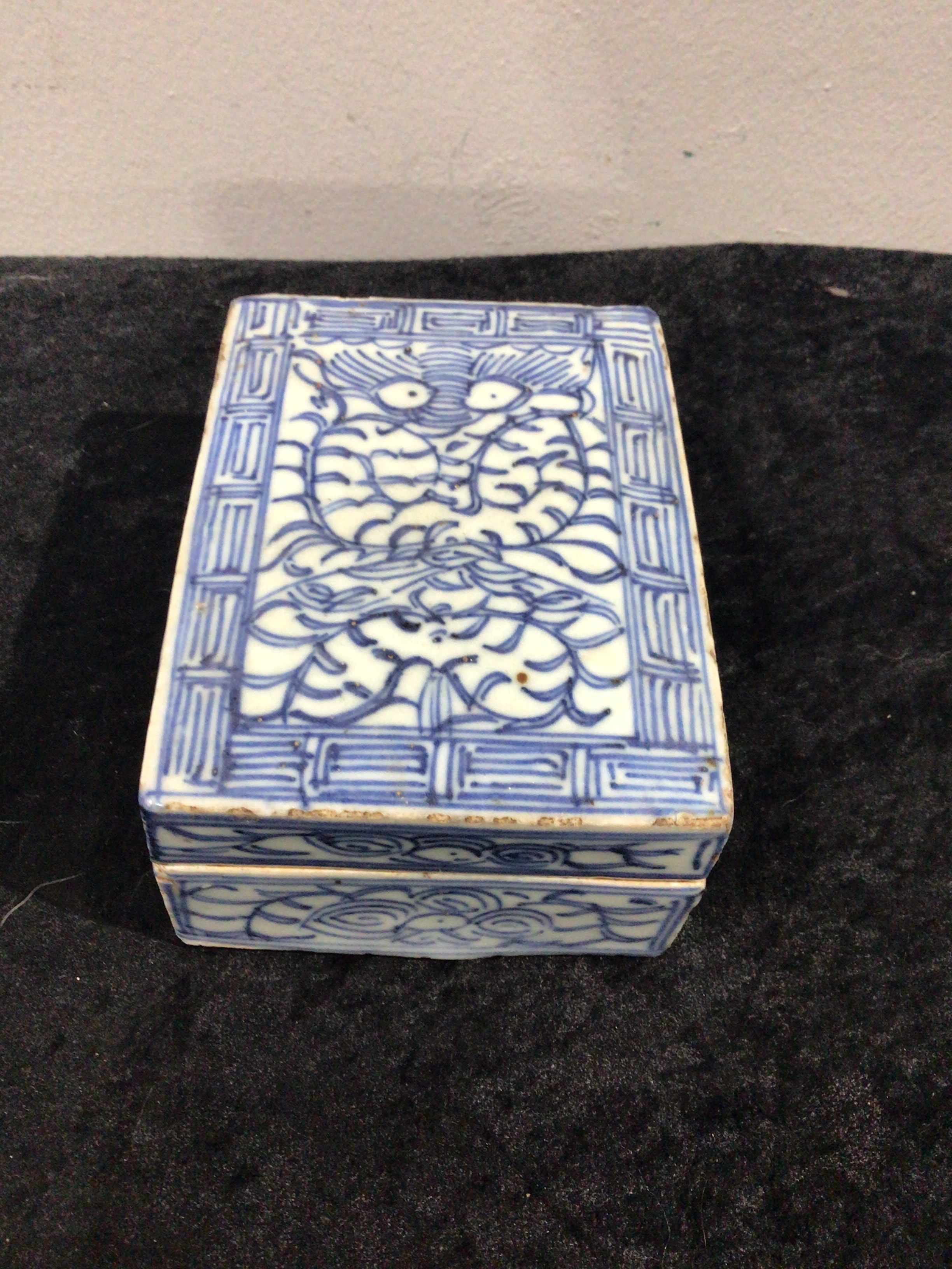 A rectangular blue and white porcelain lidded box, displaying an East Asian aesthetic. The lid is decorated with a central design of two stylized mythical beasts or dragons facing each other, set within a geometric fretwork border, while the lid’s sides feature blue and white scrollwork. The interior is white glazed. The unglazed base reveals a faint, vertically oriented four-character mark, “æ˜¥è‹‘å ‚è£½” (ChÅ«n Yuà n Táng zhì), tentatively translating to “Made for/at Spring Garden Hall”.