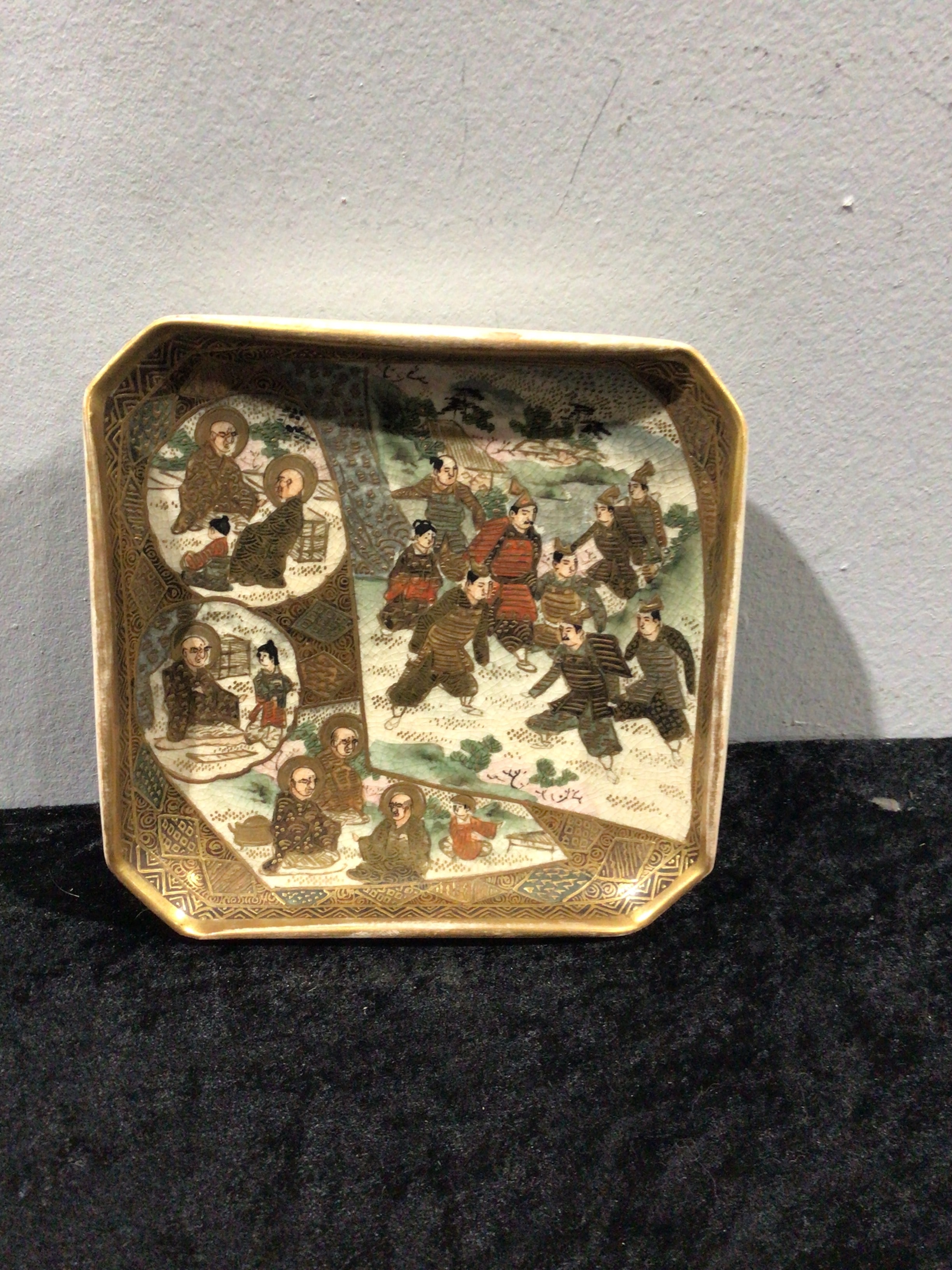 A Japanese Satsuma ware octagonal plate, bearing the Kentani mark. Decorated with intricate polychrome enamels and extensive gilding. The obverse features a central scene depicting numerous male figures, possibly warriors or villagers, engaged in an outdoor activity amidst a snowy landscape. Surrounding this central motif are four lobed cartouches, each containing one or two seated or standing figures, possibly scholars or elders, interspersed with highly detailed geometric and floral gold-on-red patterns. The reverse reveals an unglazed raised foot rim on a crackled off-white glaze background. A square gold cartouche at the center of the base contains four black characters, which translate to Satsuma Kentani (薩摩賢谷).