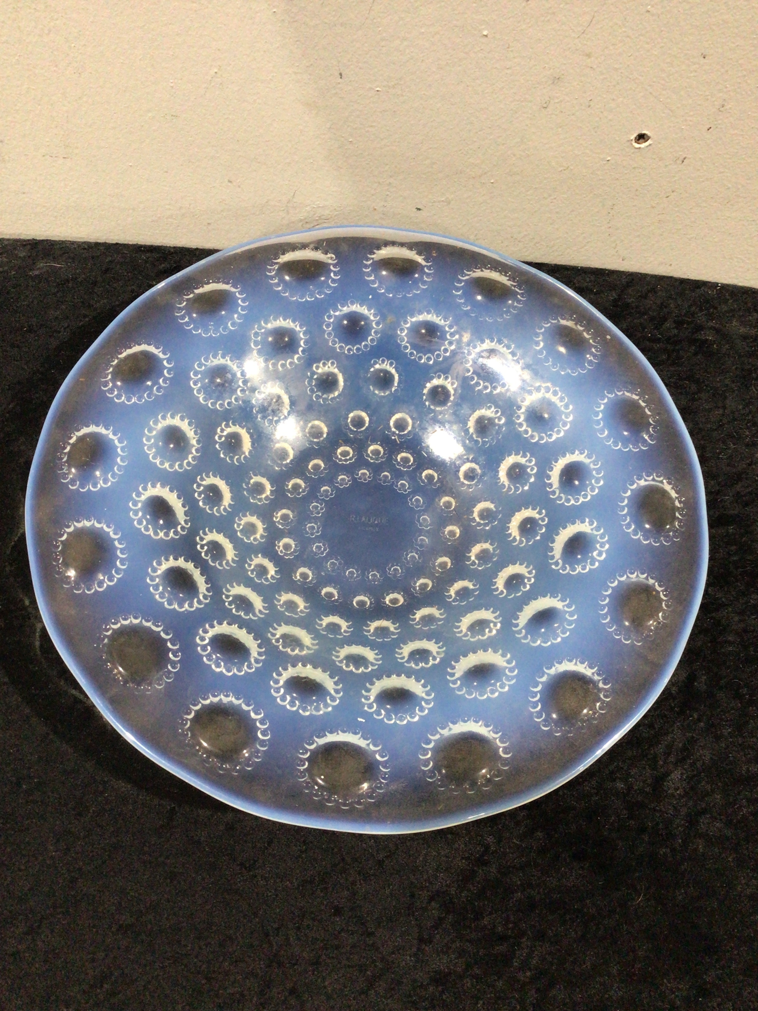A R. Lalique Asters Opalescent Coupe Ouverte Bowl, designed circa 1935. This circular opalescent glass bowl or shallow dish exhibits a milky white rim transitioning to a deep blue-purple hue towards the center. It is decorated with an array of concentric rings of raised, bubble-like or scalloped circular motifs across its surface. Molded into the center underside are the clear markings “R. LALIQUE” and “FRANCE.”