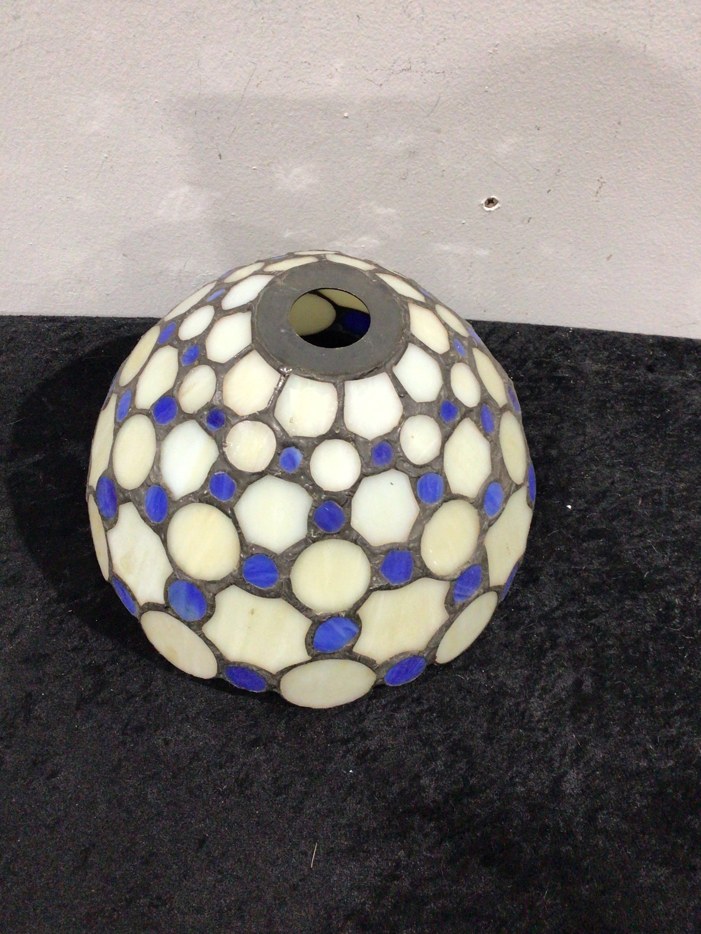 A Tiffany-style leaded art glass lampshade, dome-shaped and constructed from numerous pieces of soldered art glass. The design features a mosaic of opalescent cream/pale yellow glass segments, predominantly irregular polygons and ovals, interspersed with smaller, rounder, vibrant blue glass pieces, arranged in a concentric, organic pattern. A dark, metallic collar forms the finial opening at the apex. No visible text or markings are present.