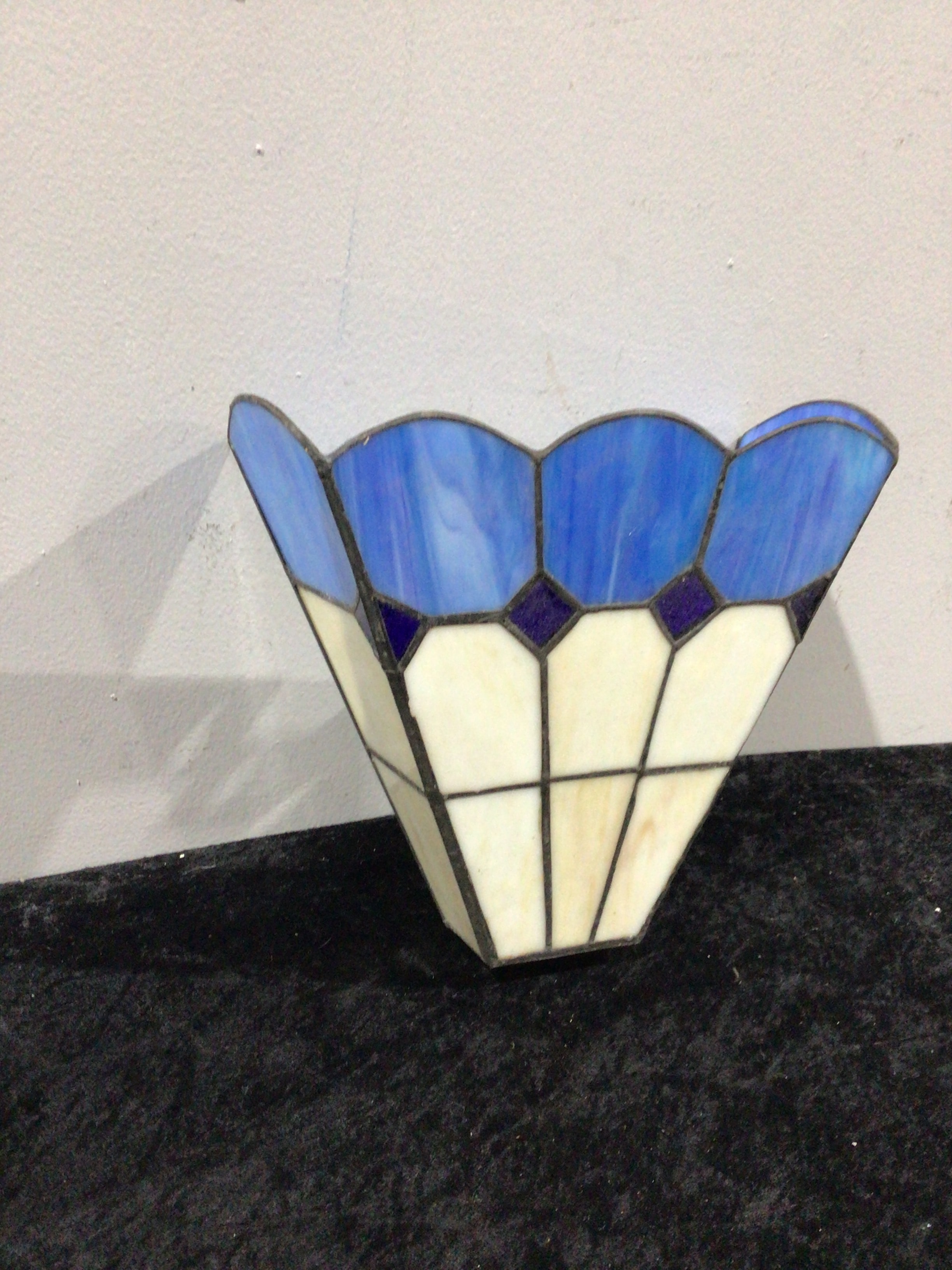 A Tiffany Style Stained Glass Lamp Shade Replacement, constructed in an inverted trapezoidal shape with a scalloped top rim. It features a geometric design of leaded or copper-foiled glass panels, primarily showcasing streaky and opalescent blue glass in the upper section, transitioning to cream/off-white opalescent glass below, accented by small hexagonal dark blue pieces at the transition line. The interior exhibits three circular mounting holes along the upper edge, consistent with attachment to a light fixture. No visible text or markings are present.