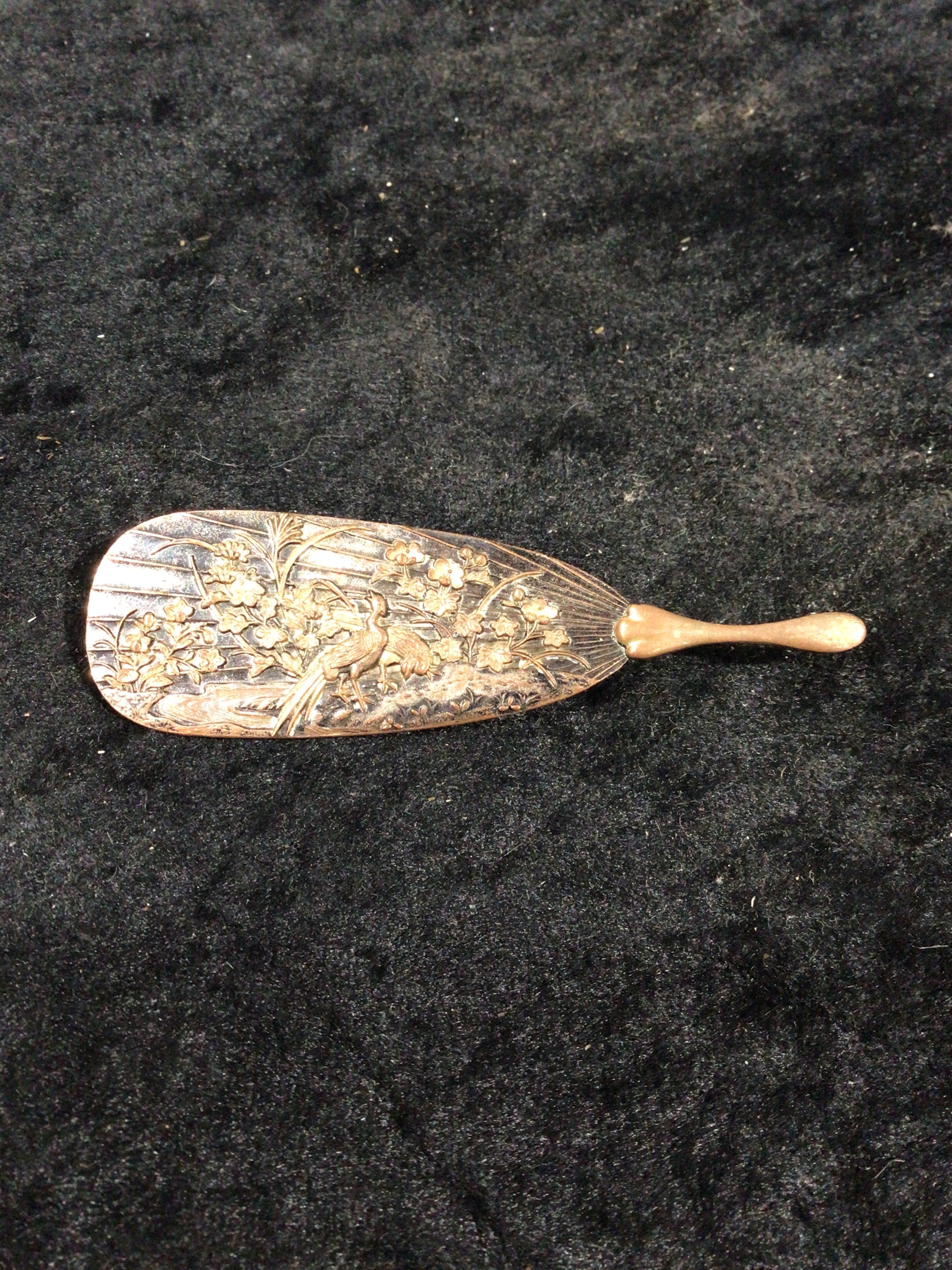 Victorian Copper Fan-Shaped Brooch with Birds and Flowering Branches