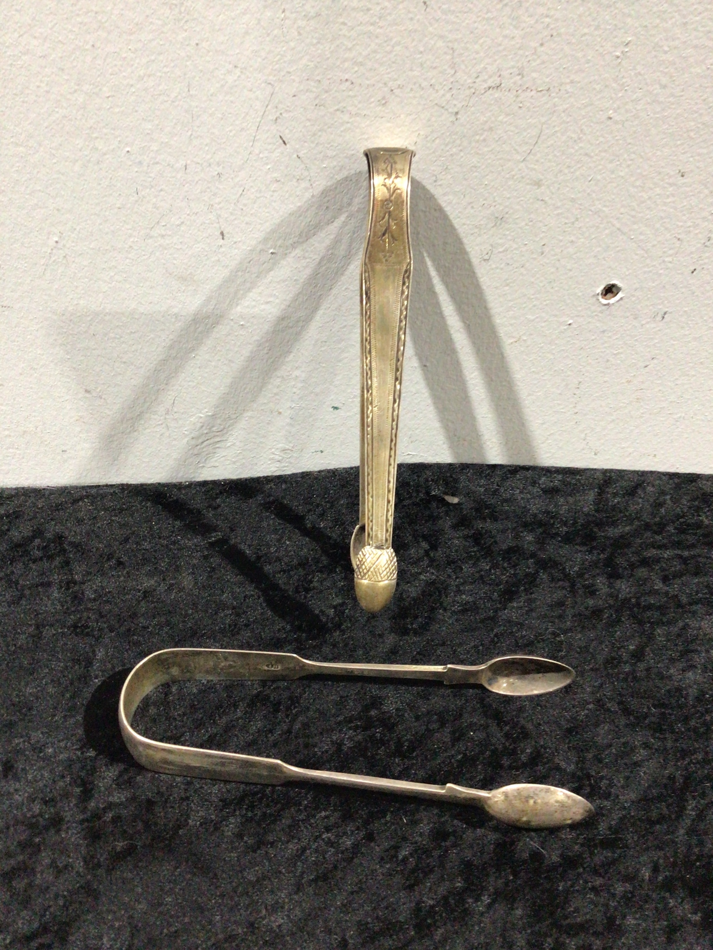 This lot features a pair of antique silver tongs. The first, a U-shaped sugar tong, is consistent with antique English Georgian examples, bearing four vertically stacked hallmarks on its interior. The second item is a longer, spring-action serving tong, adorned with intricate engraved floral and foliate decoration along its upper arm and a stylized, possibly pinecone-shaped finial at its pivot. This second tong bears a rectangular maker’s mark with the impressed initials ‘CH’. The items are confirmed to be made of Silver. Both items exhibit surface scratches and minor scuffs consistent with age and use, yet appear structurally intact.