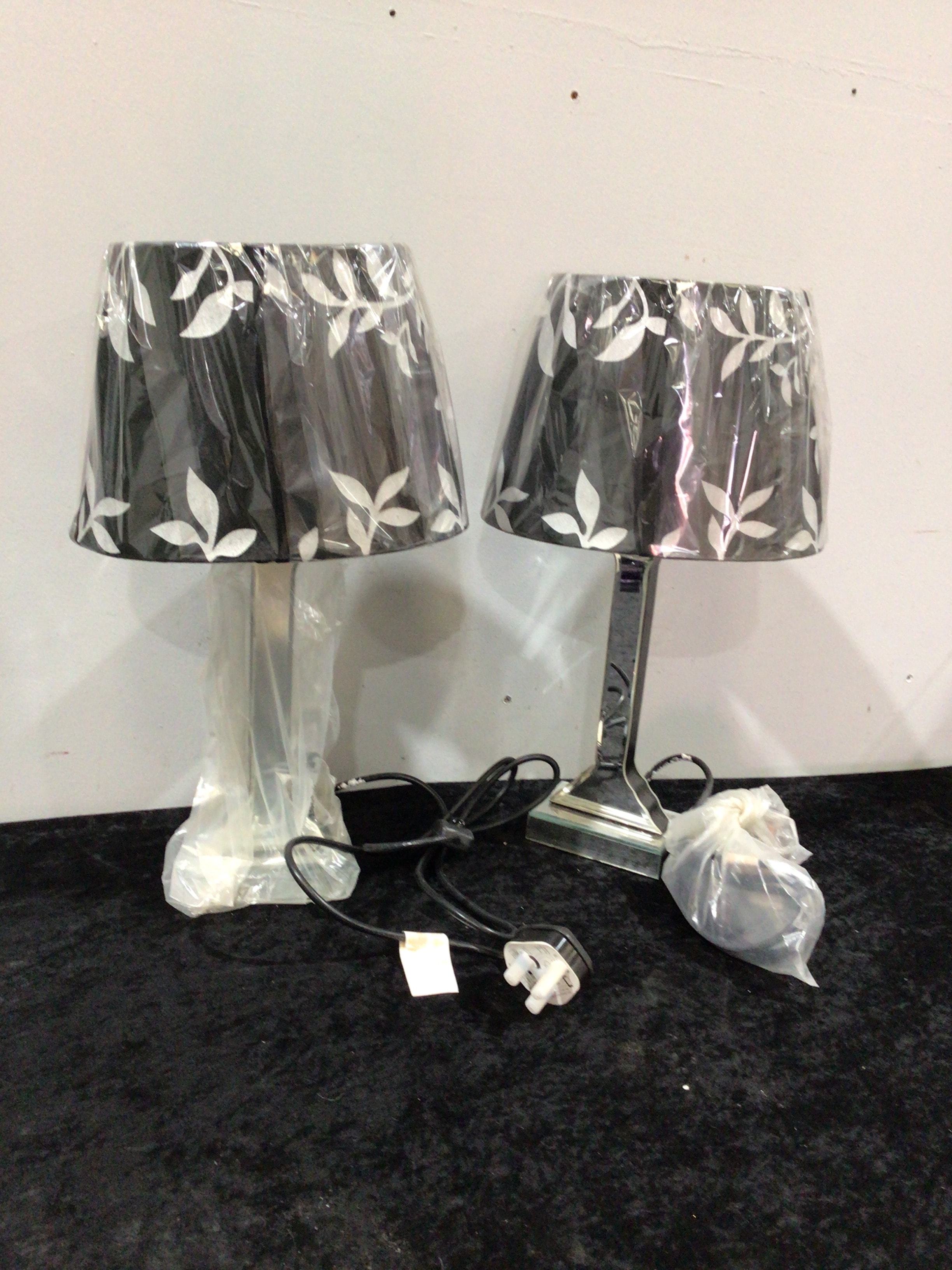 A pair of modern table lamps, each featuring a black fabric drum shade adorned with a white stylized leaf pattern, currently wrapped in protective plastic. One lamp base is constructed from clear acrylic or glass in a square column design, also encased in plastic. The other lamp features a polished chrome or similar silver-tone metal finish with a rectangular base and tapering square column. Both lamps are equipped with black electrical cords terminating in UK-standard 3-pin plugs.