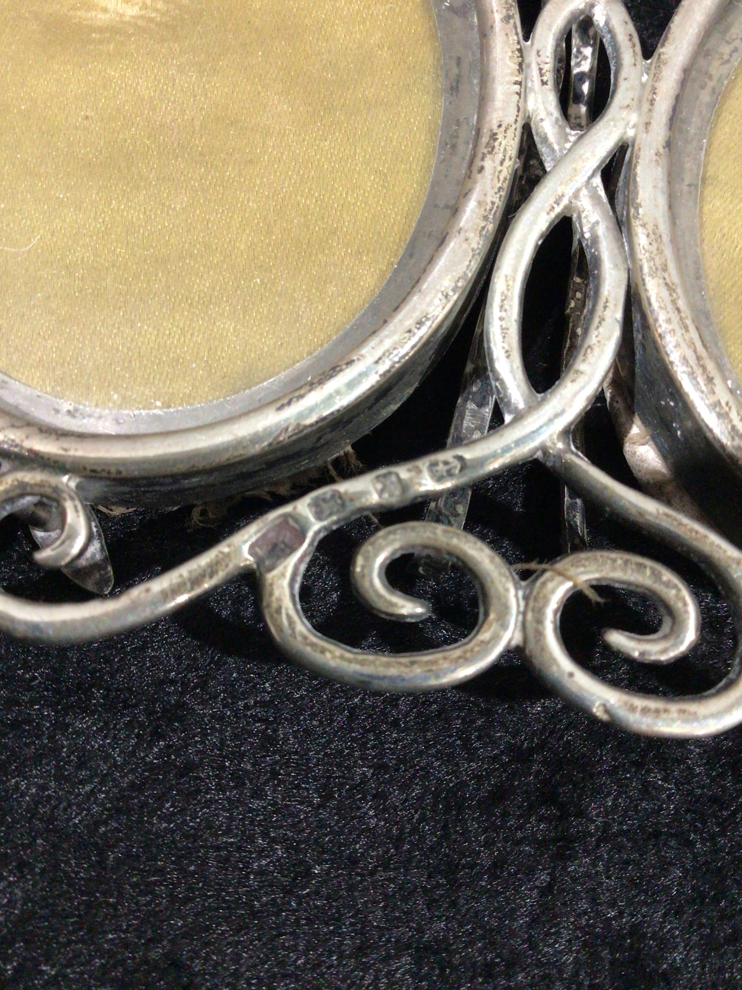 A desktop double photo frame crafted from silver, clearly marked with an hallmark along with a profile head mark and other assay symbols. The item displays a distinct Art Nouveau style, featuring ornate, flowing, and intertwining scrolled decorative elements that connect the two oval frames and form its base. Each frame currently contains a faded, textured golden-yellow backing. A hinged stand is present at the rear.