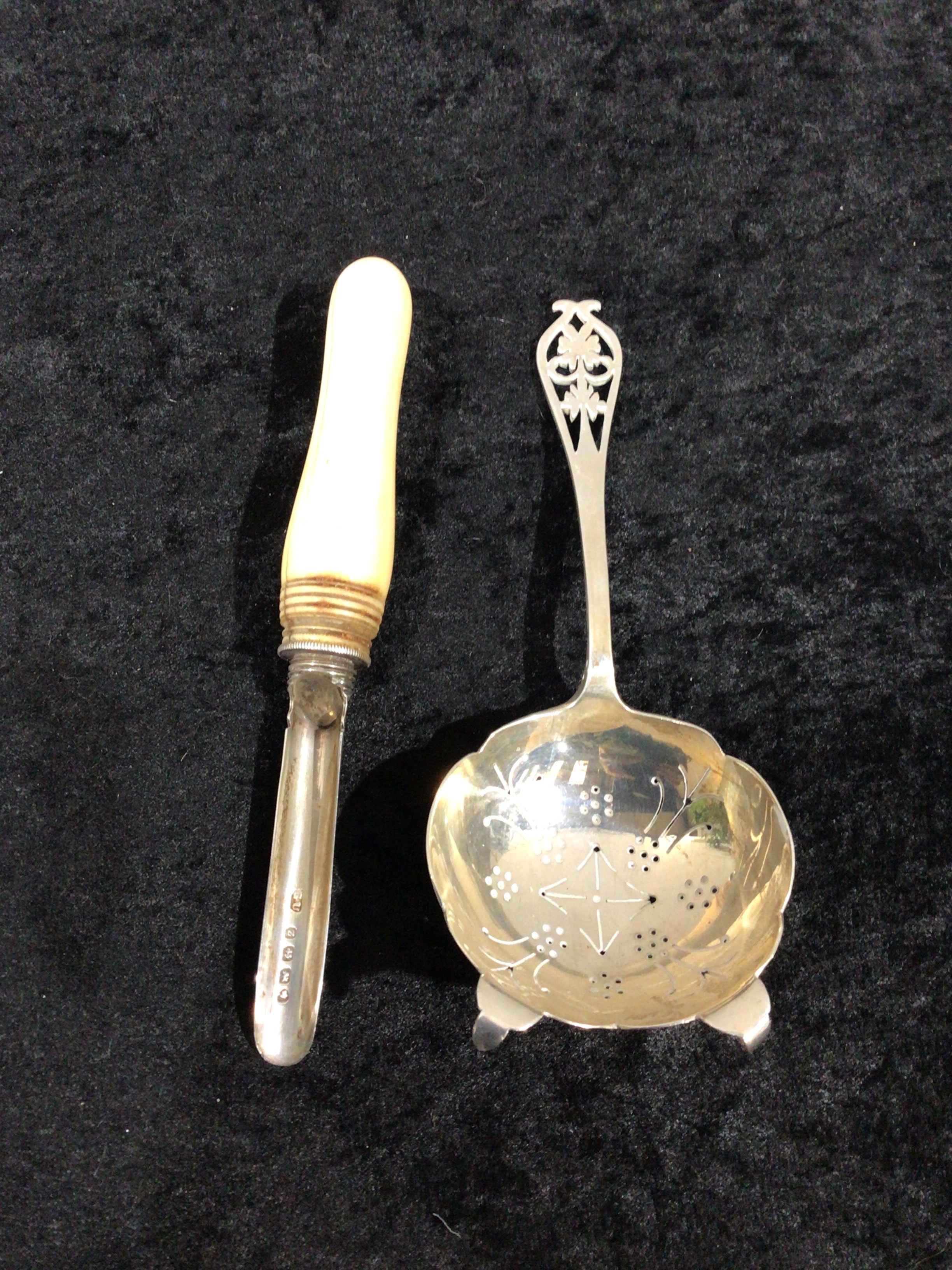 A Pair of Silver Flatware Items: A Marrow Scoop with Bone Handle and a Tea Strainer