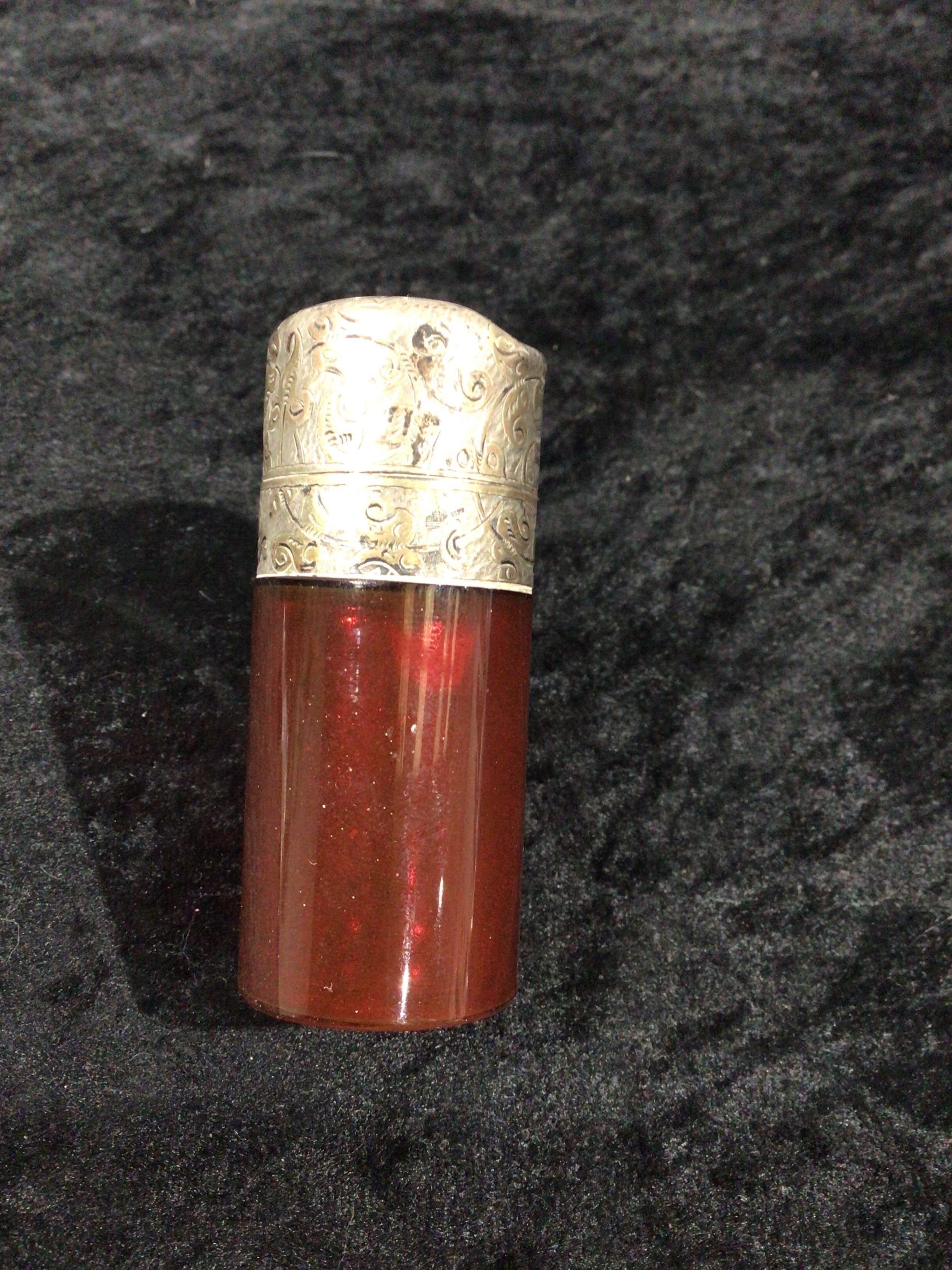 A Charles May Birmingham Sterling Silver and Cranberry Glass Scent Bottle, dated 1894. This small, ornate, hinged-lid container features a cylindrical dark red translucent glass body. The decorative sterling silver top and hinged lid are extensively engraved with scrollwork and foliate motifs. Visible English hallmarks on both the silver collar and lid include the maker’s mark “CM,” a lion passant indicating sterling silver, an anchor for the Birmingham assay office, and a date letter ‘u’ for 1894. The container holds a reddish liquid or substance and is fitted with a clear, faceted glass stopper; the lid’s interior is lined with a pinkish-orange textile.