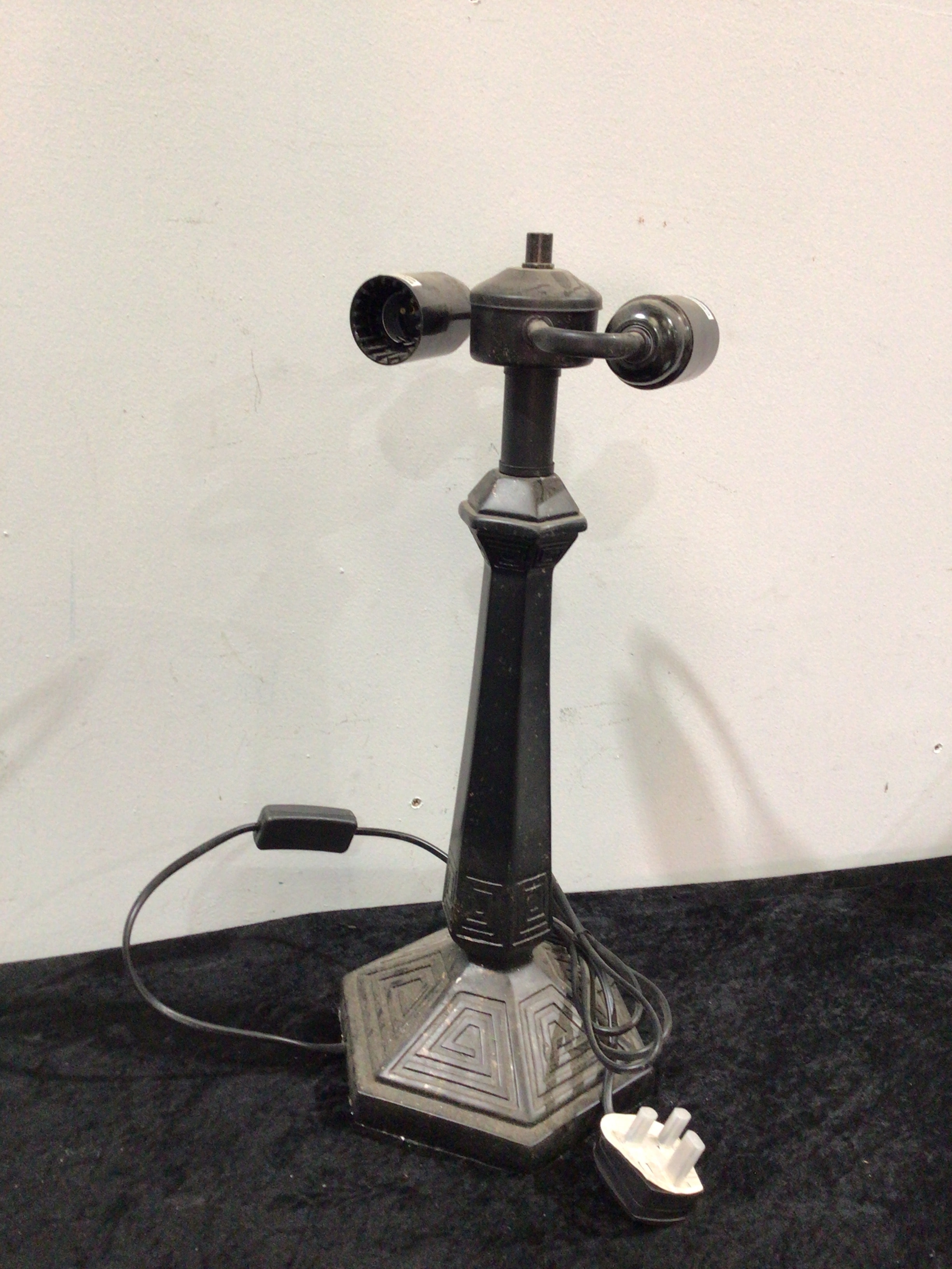 A Mission Style two-light table lamp base, constructed from cast metal with a dark, patinated or painted finish. It features an octagonal stepped plinth with incised geometric designs, transitioning to a tapering, faceted column, topped with two horizontally opposed light sockets. The attached electrical cord terminates in a white UK 3-pin plug marked “BS 1363” and “FUSED.” No manufacturer markings are visible on the lamp base itself.