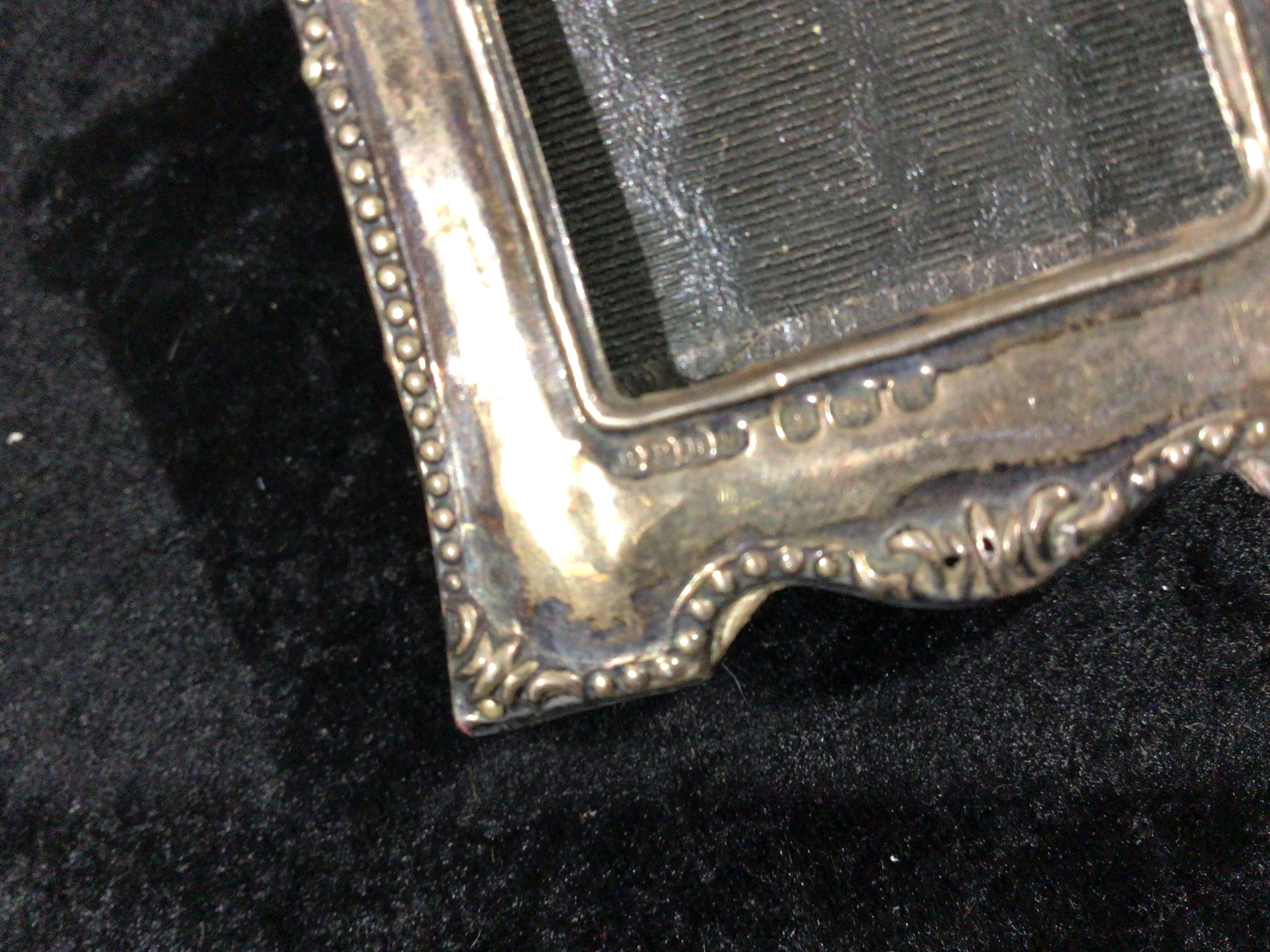 A pair of Edwardian sterling silver miniature photo frames, likely dating from the late 19th to early 20th century. The first frame is rectangular with a reeded border, featuring a blue fabric interior. The second, more ornate frame, showcases a scrolled and scalloped outline with beaded and foliate decoration, encompassing a ribbed greyish-green fabric interior. Both frames include glass inserts. The ornate frame prominently displays a series of punched hallmarks on its side, including what appears to be a lion passant, indicating British sterling silver.