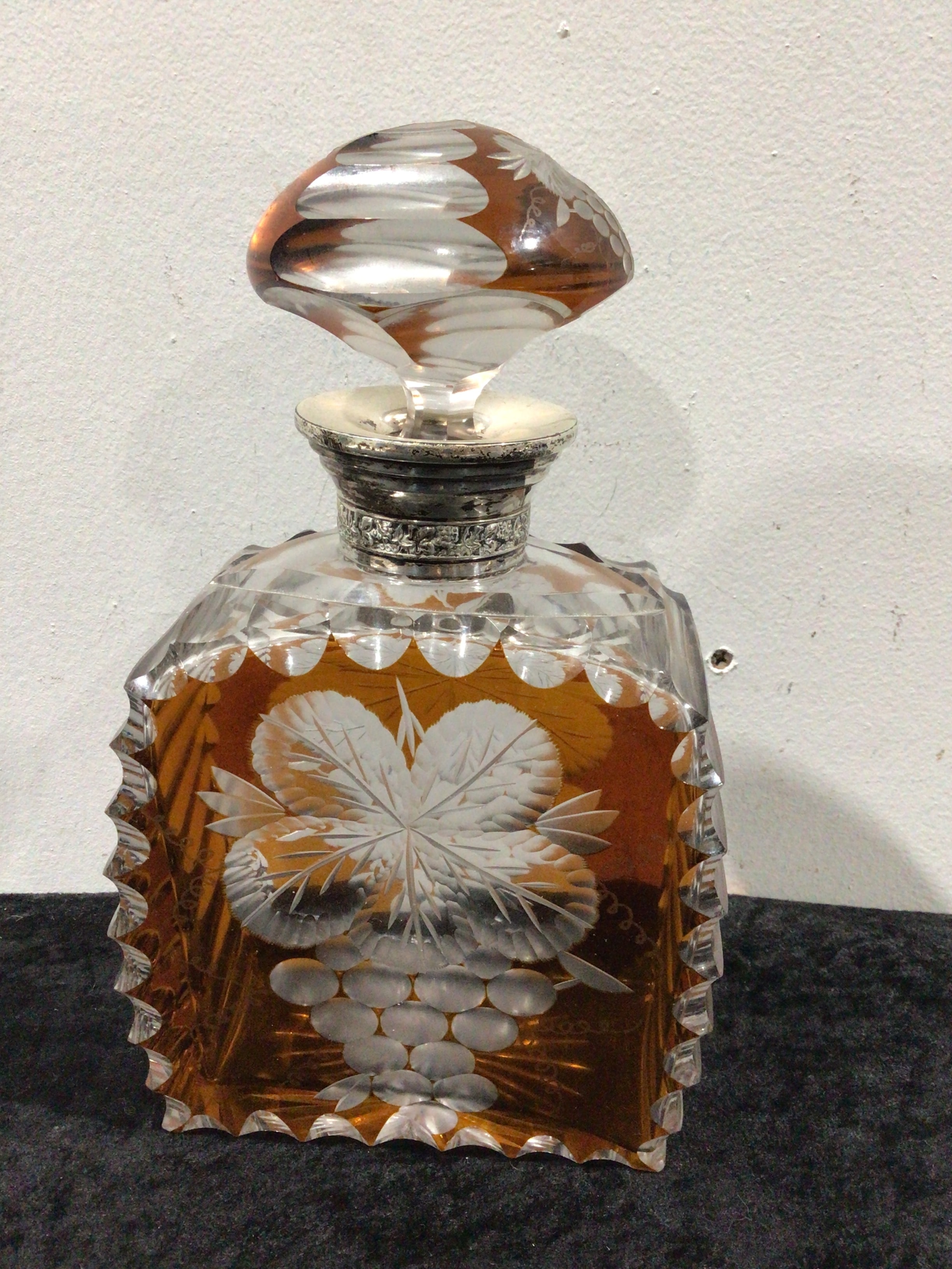 An Edwardian Silver Topped Cut Glass Perfume Scent Bottle, hallmarked London 1905. The square-bodied bottle is crafted from clear cut glass, featuring intricate geometric cutting along its edges and etched botanical motifs of grapevines and leaves on the main body. It contains an amber-colored liquid. The bottle is fitted with a matching faceted stopper, also displaying floral etching. The neck is adorned with a heavily tarnished Silver collar, which includes a hinged cap and ornate embossed decoration. Close inspection of the collar reveals discernible hallmarks, including a lion passant, a crowned leopard’s head for the London assay office, and a date letter ‘e’, strongly indicating British sterling silver manufacture from 1905. The overall design is consistent with late 19th to early 20th-century period.