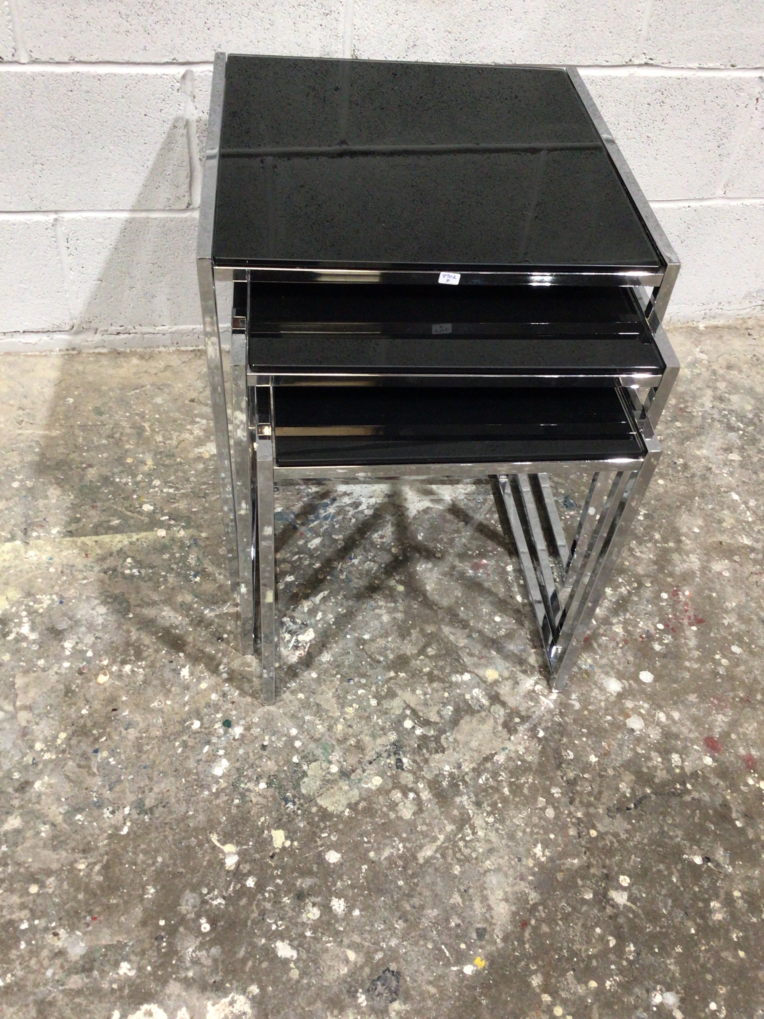A Set of Three Attributed to Milo Baughman Chrome and Black Glass Nesting Tables, circa 1970s