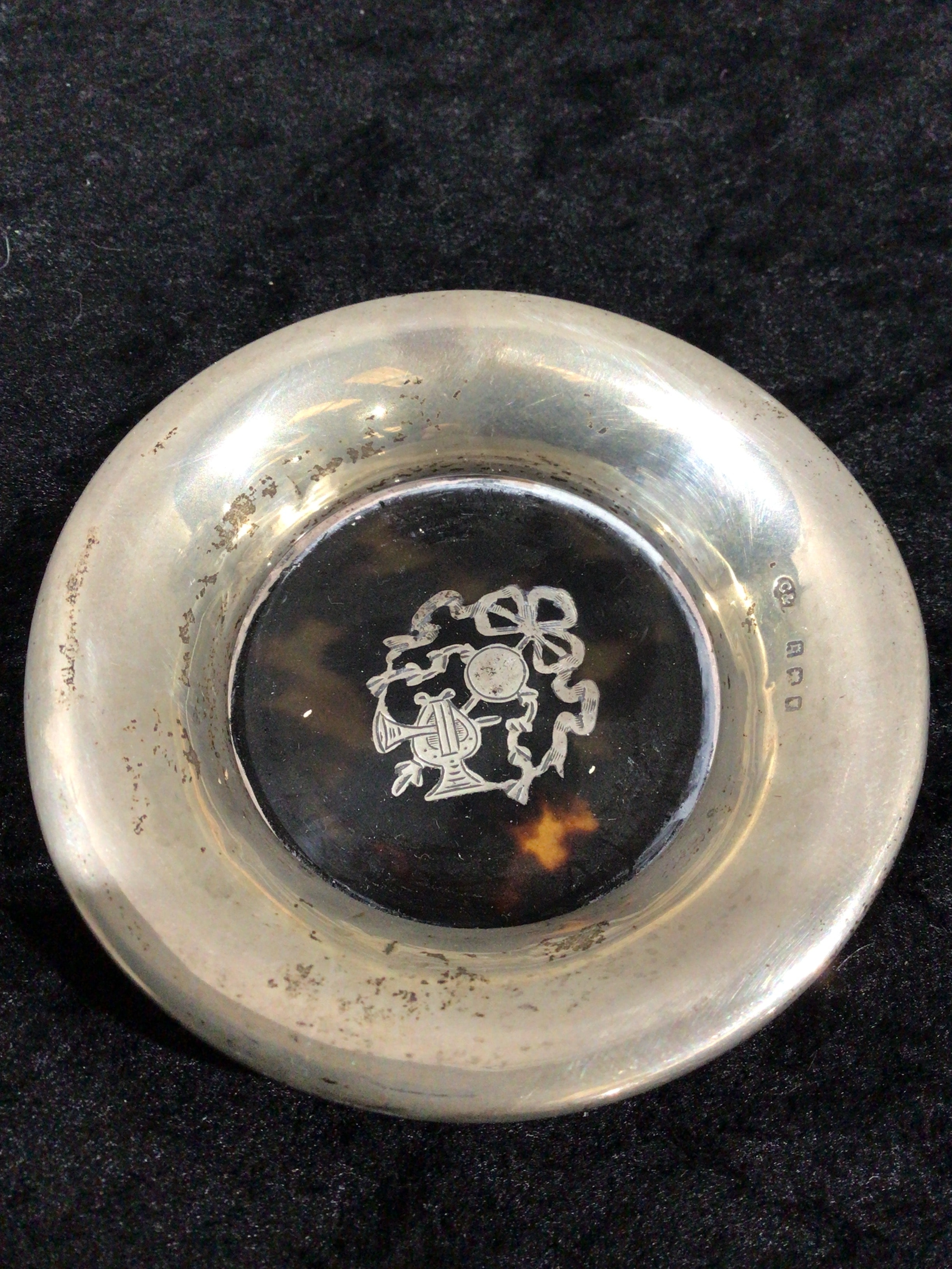 A circular, shallow dish or coaster featuring a sterling silver rim surrounding a dark, mottled central insert, consistent with tortoiseshell. The center is decoratively engraved with a classical-style musical motif, including a large bow, a drum or tambourine, a horn, and flowing ribbons. The metal rim bears clear hallmarks, notably a lion passant, a crowned leopard’s head (indicating the London assay office), and a lowercase ‘q’ date letter within a rectangular cartouche, alongside other less defined stamps, dating the piece to 1891-1892.