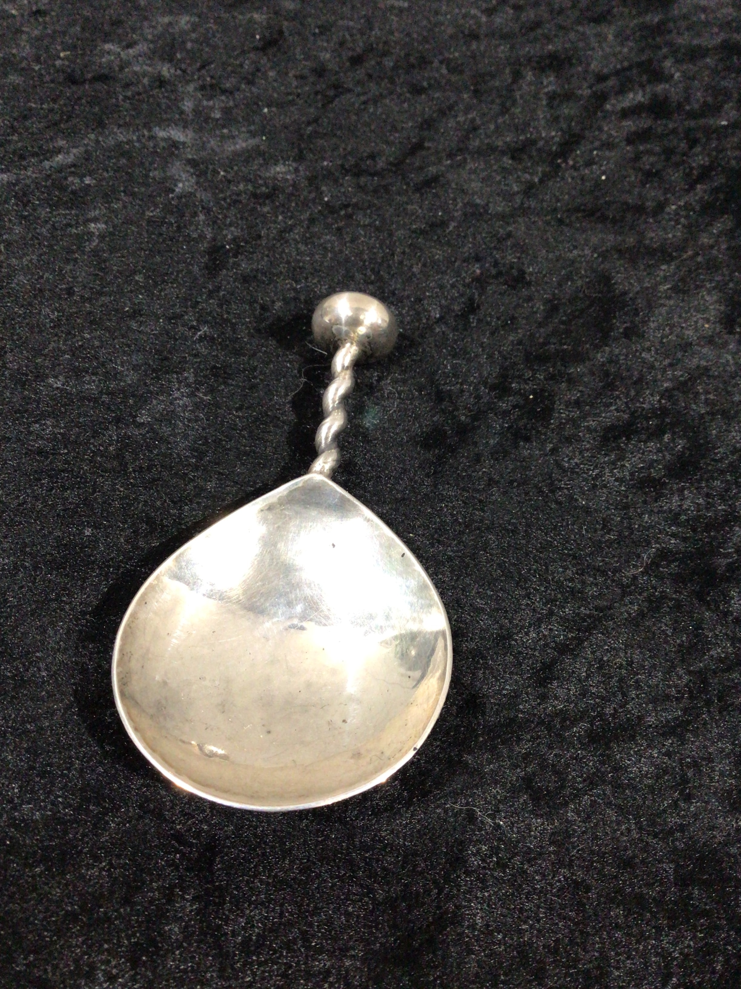 A sterling silver caddy from the George III period, featuring a teardrop-shaped bowl with a hand-hammered finish on both surfaces. The bowl transitions to a twisted stem that terminates in a spherical finial. The reverse of the bowl bears hallmarks including a crowned leopard’s head for the London assay office, a lion passant denoting sterling standard silver, and a capital letter ‘Z’ within a square cartouche, indicating the date letter for 1800-1801. An indistinct maker’s mark is also present.