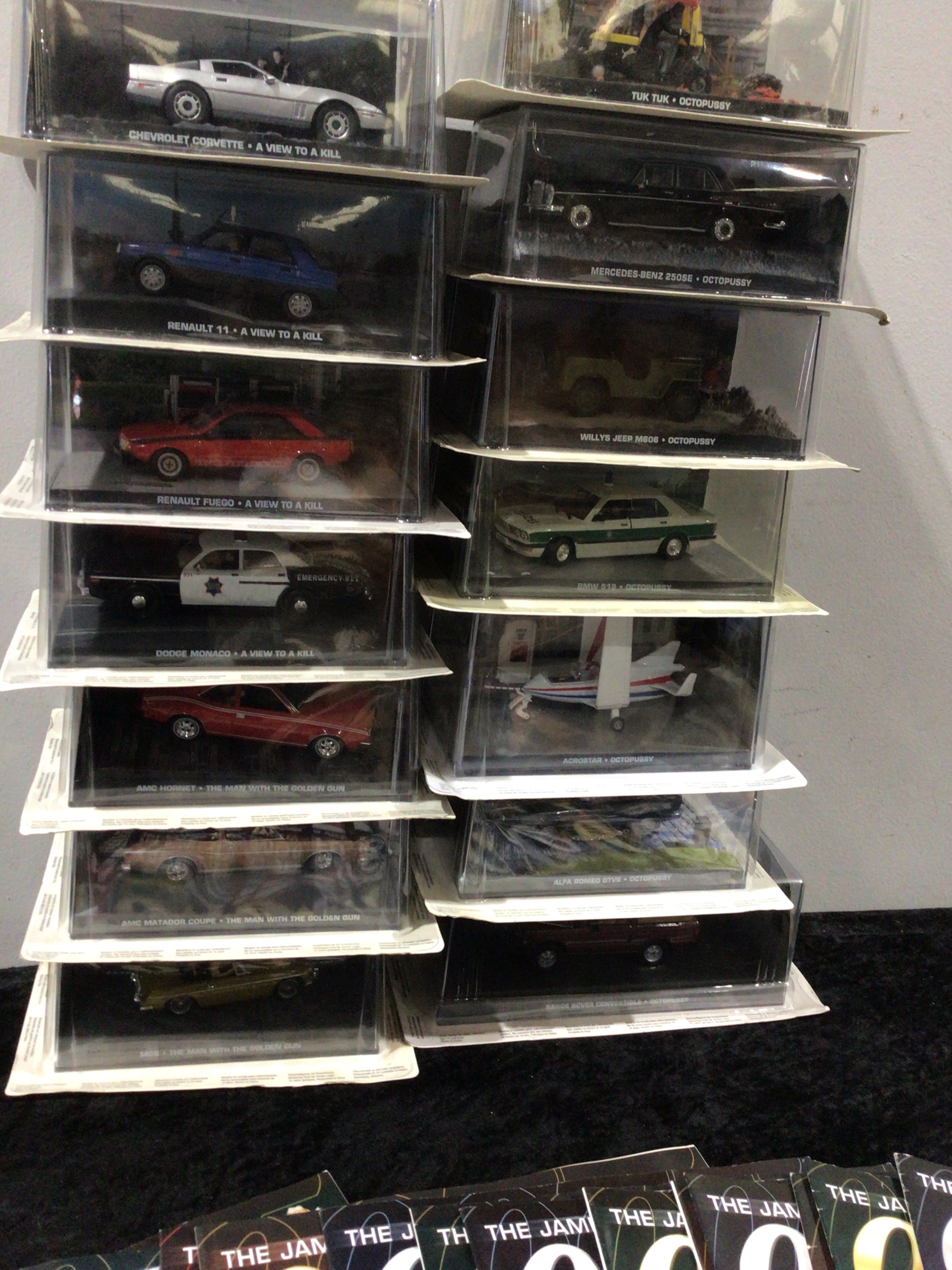 A collection of approximately two dozen die-cast vehicle models from ‘The James Bond Car Collection’. Each model, primarily cars with one airplane, is presented in its original clear plastic display case with associated descriptive text, explicitly identifying them as replicas of vehicles from various James Bond films. Examples include ‘CHEVROLET CORVETTE – A VIEW TO A KILL,’ ‘MERCEDES BENZ 250SE – OCTOPUSSY,’ and ‘AMC MATADOR COUPE – THE MAN WITH THE GOLDEN GUN.’ Accompanying the models is a fanned stack of ‘THE JAMES BOND CAR COLLECTION 007’ magazines or booklets, one featuring Roger Moore and displaying a ‘$7.99’ price. This collection dates to the late 20th or early 21st century.