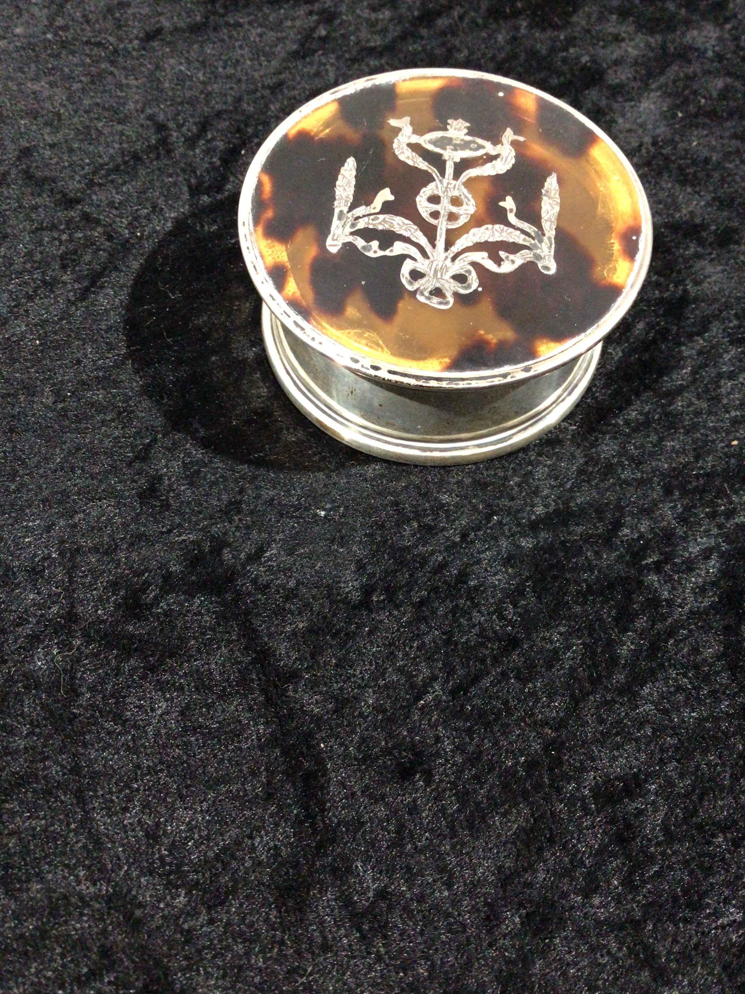 A Sterling Silver and Tortoiseshell Snuff Box by Collett & Anderson. This small, round lidded box features a silver-colored metal base and a tortoiseshell lid. The lid is adorned with an ornate, stylized silver-colored metal inlay depicting a central staff-like element flanked by what appear to be anchors or stylized ‘A’s, intertwined with ribbons. The interior of the box is gilded. Visible partial hallmarks on the side of the metal body appear to read ‘S.A G LTD’.