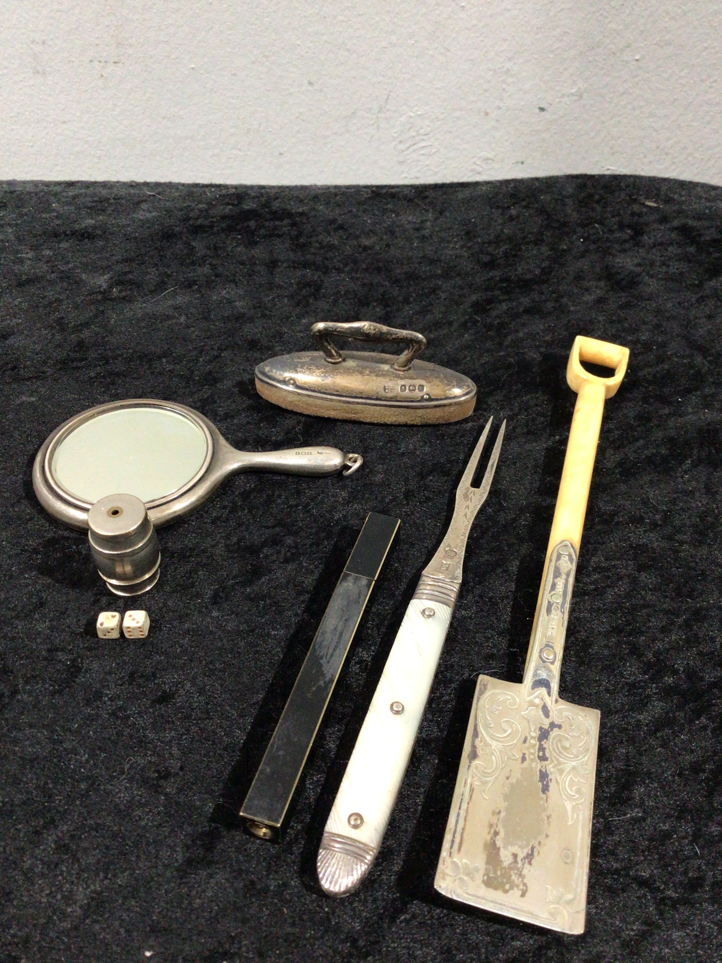 A collection of antique or vintage miniature desk and vanity items, primarily sterling silver. The group comprises seven pieces: an oval hand mirror with a slender handle, marked “BCU” and an indistinct mark; a miniature oval ink blotter with a padded base, featuring prominent English hallmarks including a lion passant, anchor for Birmingham assay, a date letter, and a maker’s mark, confirming sterling silver; a small two-tined fork with an ornate handle inset with cream-colored panels (likely mother-of-pearl or celluloid) and indistinct marks; a miniature shovel with an engraved blade and a cream-colored handle; a small cylindrical metal container; a slender rectangular dark-colored case with metal accents; and two small white dice. The items are consistent with a personal desk or vanity set.