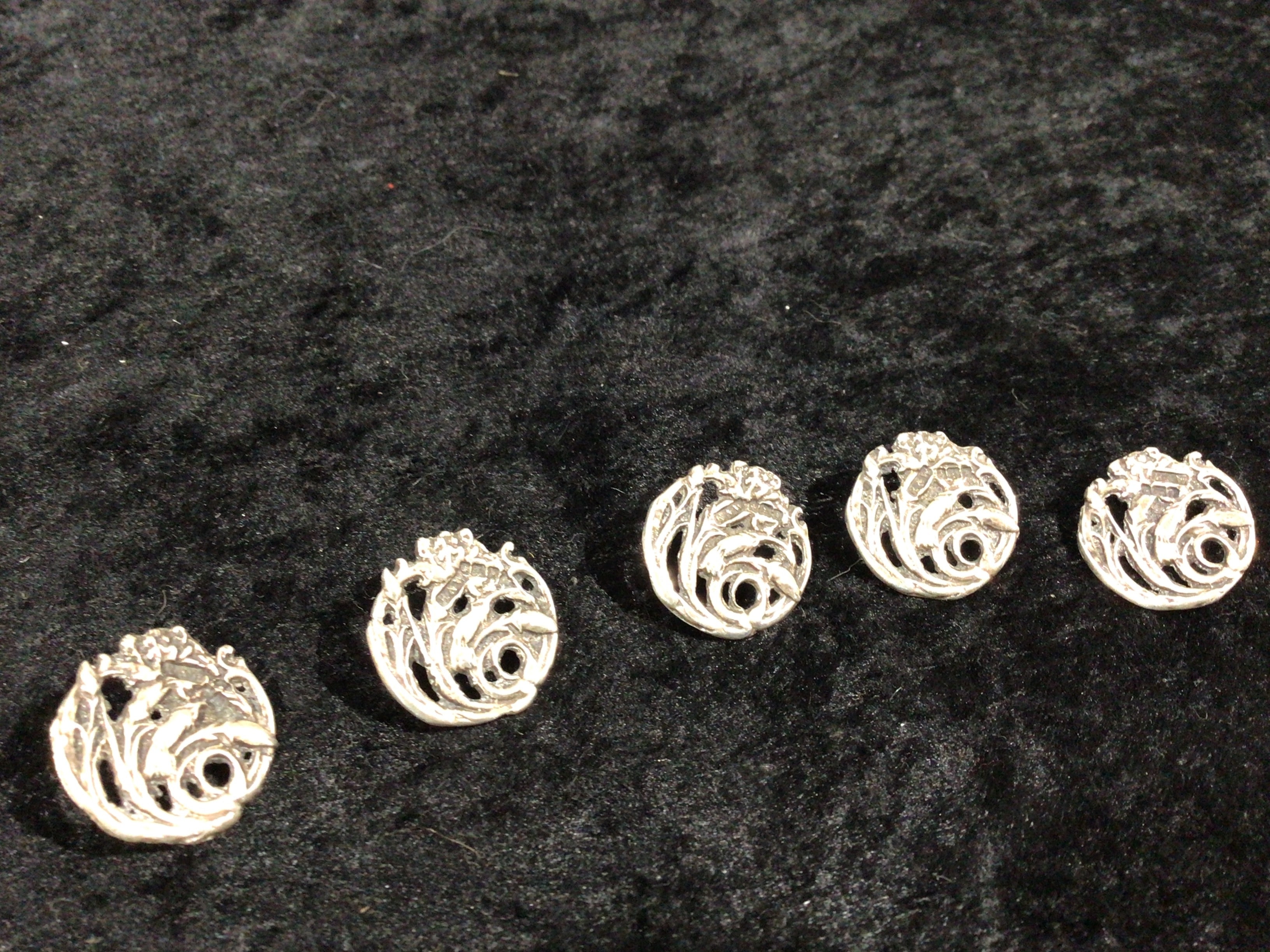 A set of five antique Art Nouveau buttons, crafted from Silver. Each circular button features an openwork design with highly stylized organic and foliate scrollwork, centered around a small circular opening. The intricate pattern includes swirling forms and an upper crest-like detail.