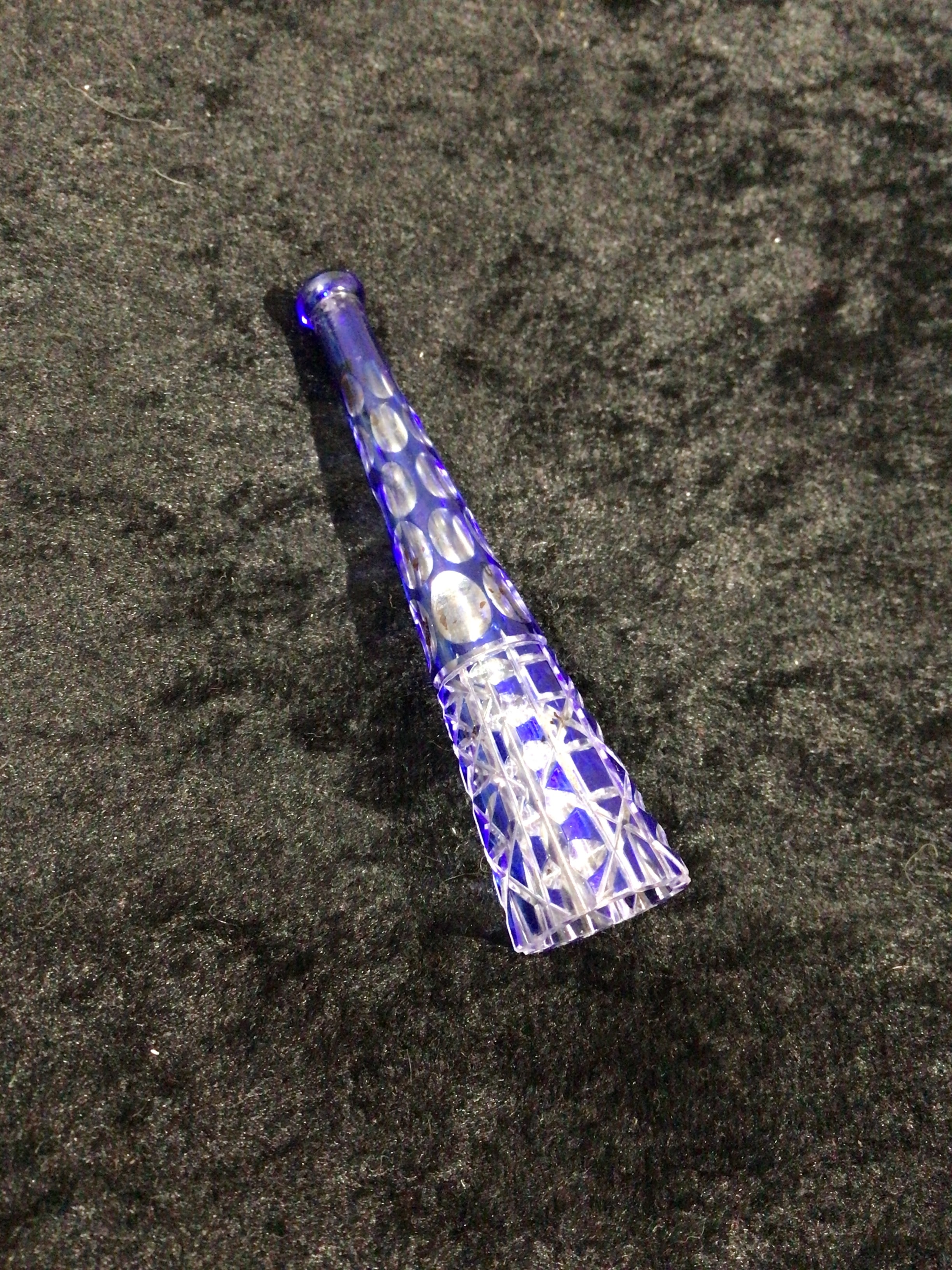 An antique Bohemian cut cobalt blue glass cigarette holder. This small, tapered item features clear circular depressions in its upper portion, while the lower body is adorned with geometric faceting, possibly diamond or criss-cross cuts, revealing clear glass sections. No visible text or markings are apparent.