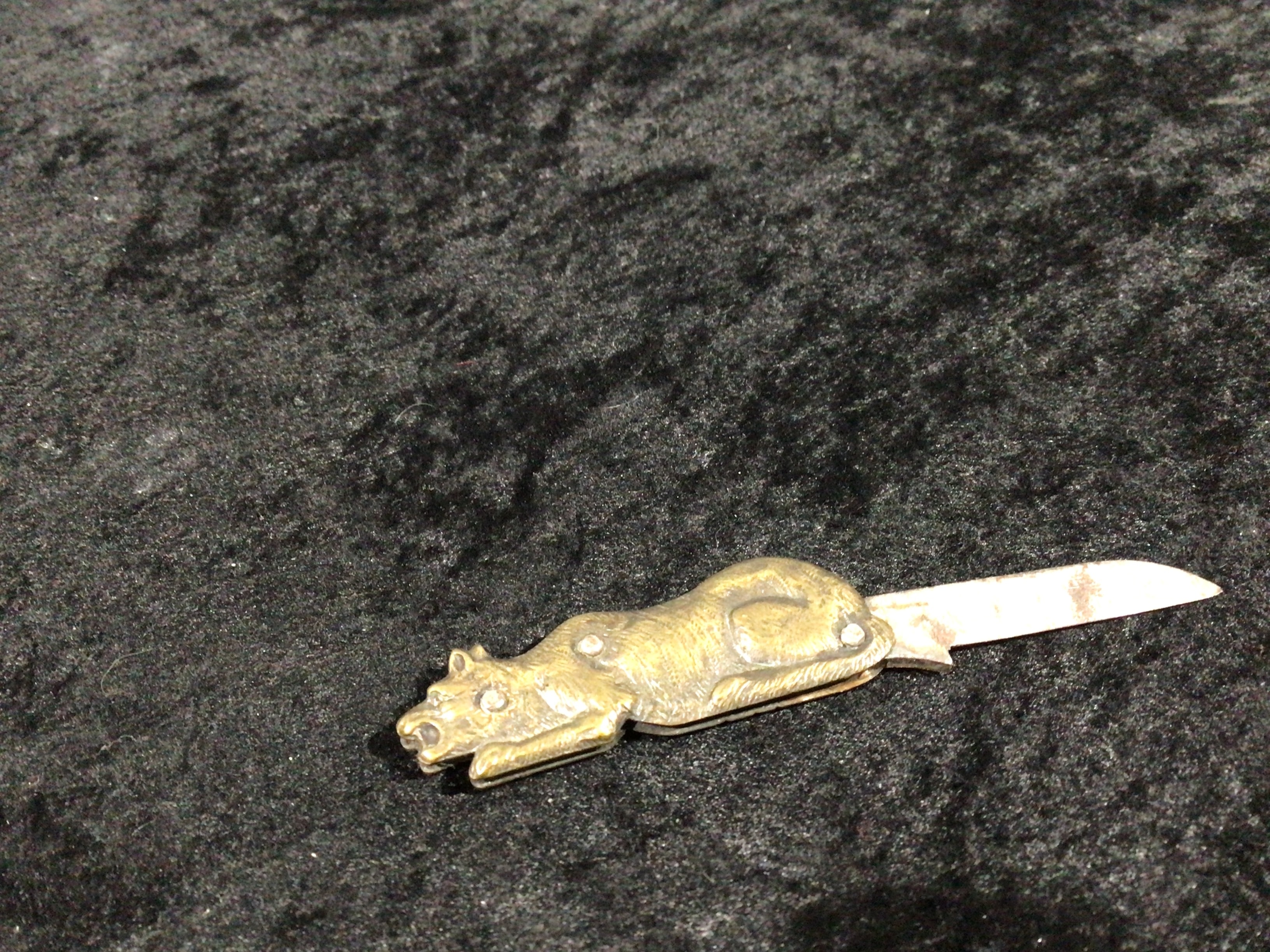 A French Victorian figural folding pocket knife, circa late 19th century, featuring a handle cast in yellow metal, likely brass or bronze, shaped like a crouching cat with an open mouth. The animal form exhibits textured details and is secured to the blade assembly by two visible rivets. The blade, appearing to be steel, shows considerable surface oxidation, discoloration, and tarnish. No discernible text or manufacturer’s marks are visible on either the handle or the blade.