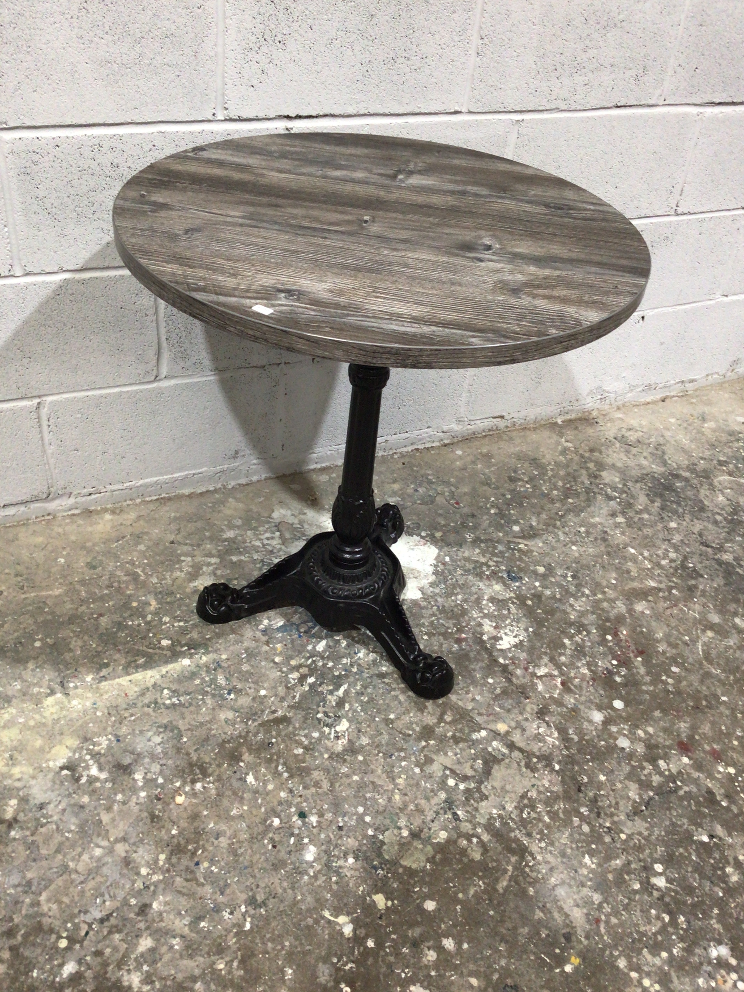 A round pedestal table, designed in a modern industrial or vintage style, suitable for bistro or cafe settings. It features a circular top with a distressed greyish-brown wood-grain finish, which appears to be wood or a laminate. The top is supported by a dark, likely black, metal pedestal base, characteristic of cast iron construction. The base is composed of a central fluted column rising from a four-footed ornate base, detailed with decorative scrollwork and paw-like feet. No visible text or markings are discernible.