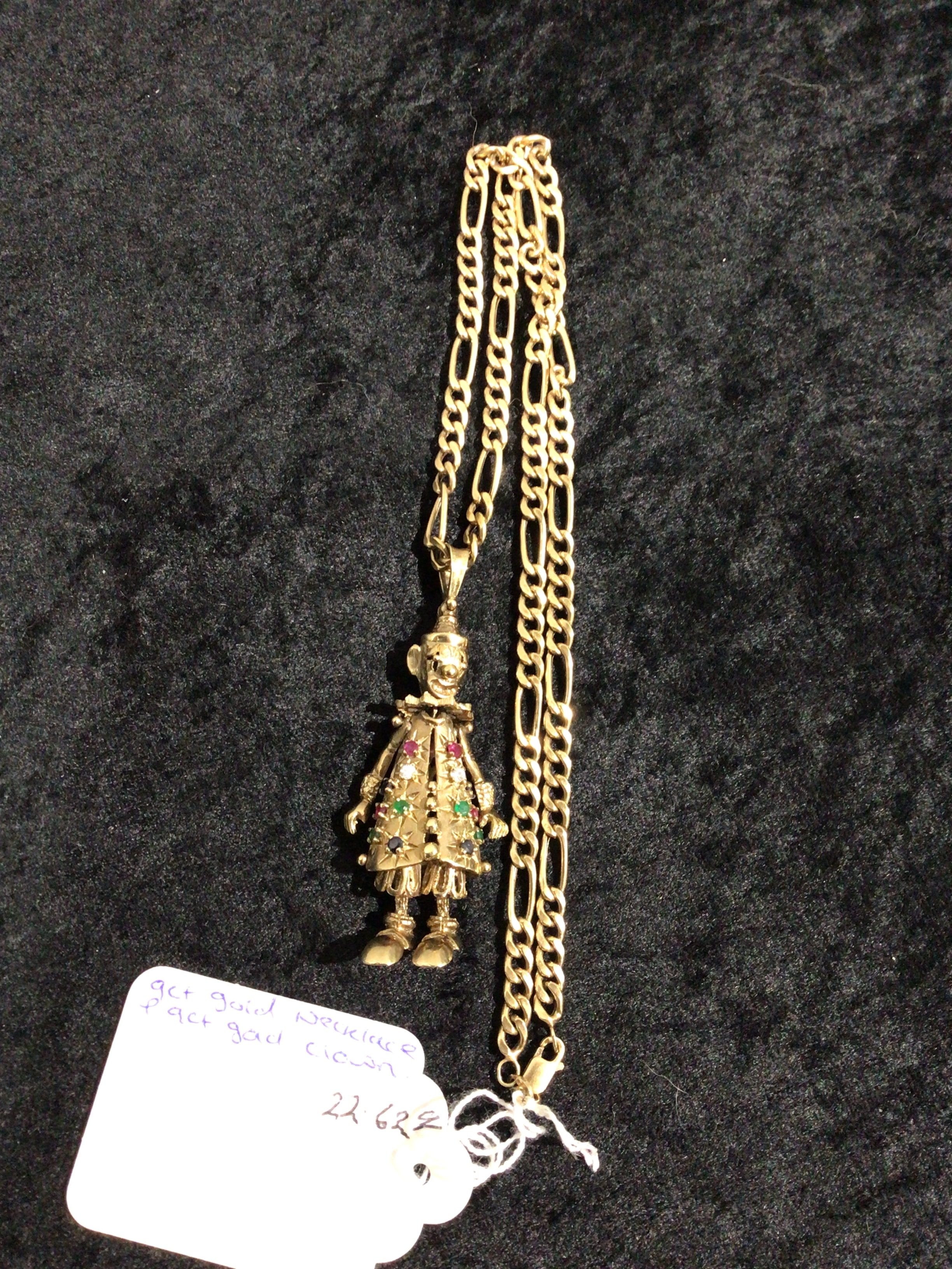 A 9ct gold articulated clown pendant and chain. The necklace features a Figaro-style chain secured by a lobster clasp. The detailed figural clown pendant, crafted from 9-carat gold, is embellished with various faceted gemstones in red, green, blue, and clear, set into its patterned costume.
