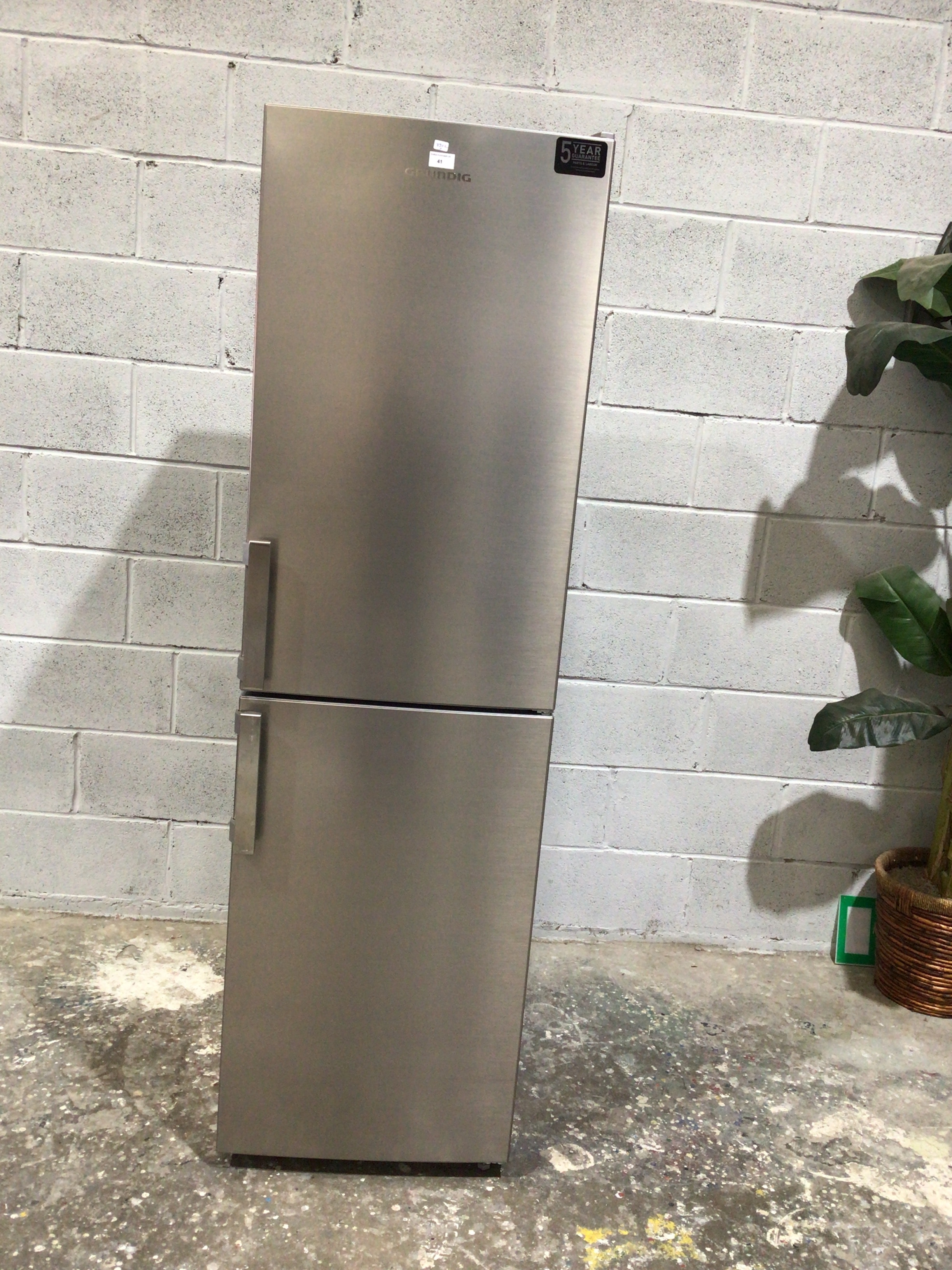 A modern GRUNDIG GKF15810N freestanding bottom-freezer refrigerator. The unit features a brushed metallic grey or stainless steel finish with the ‘GRUNDIG’ brand logo on the upper door and a ‘5 YEAR GUARANTEE’ sticker. The refrigerator compartment is fitted with multiple glass shelves and clear door bins. The lower freezer section contains several clear pull-out drawers. Manufactured by Arcelik A.S. Refrigerator Plant in Eskisehir, Turkey.