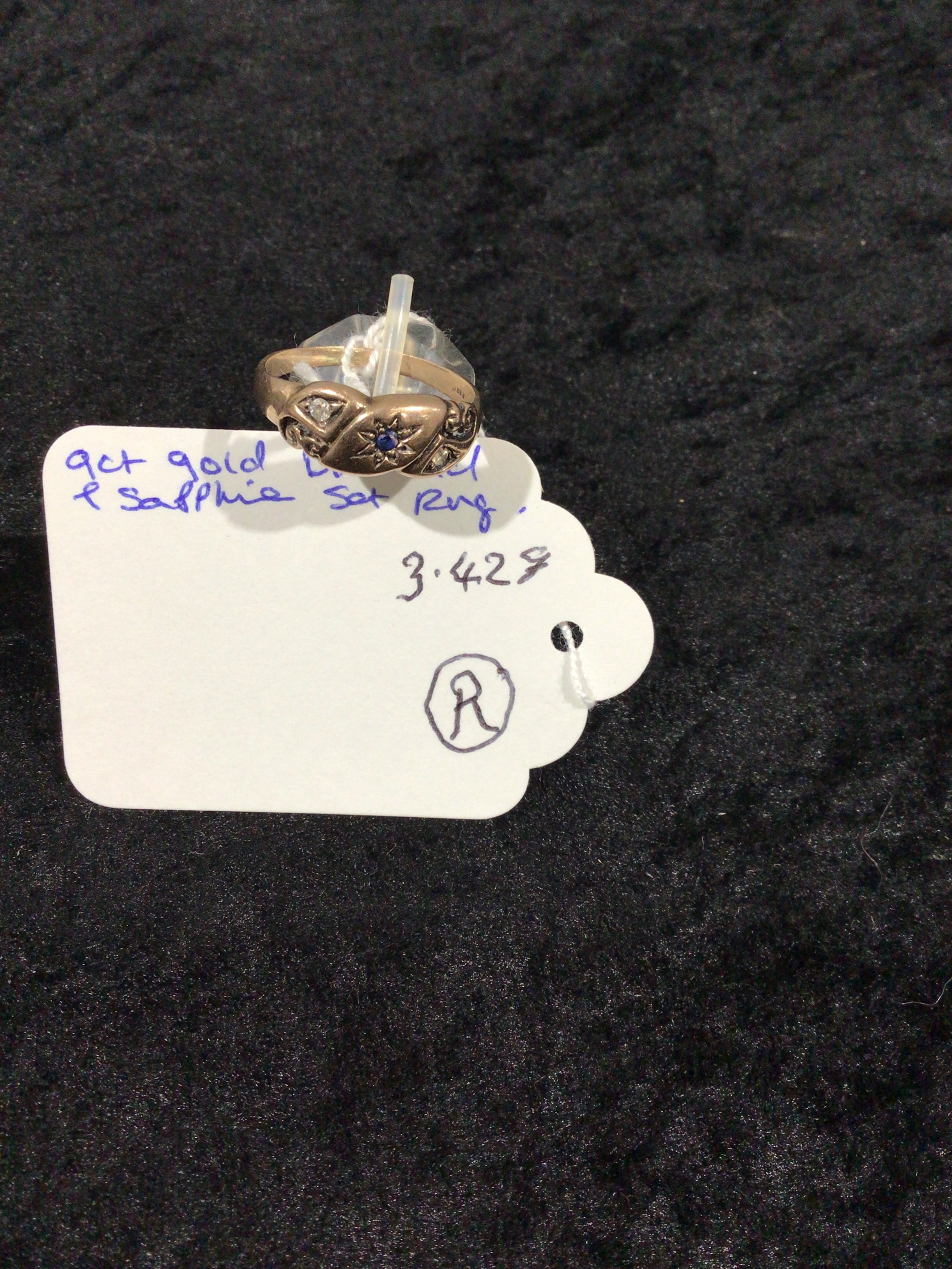 An antique ring, likely dating from the Edwardian or late Victorian period, crafted from 9ct yellow or rose gold. The ring features a central round blue sapphire, identified on the accompanying tag, set within a distinctive starburst-like engraving. Flanking the central sapphire and extending onto the decorative shoulders are smaller colorless gemstones, likely diamonds. The overall design is consistent with a gypsy setting style. Hallmarks are visible on the interior of the ring band.