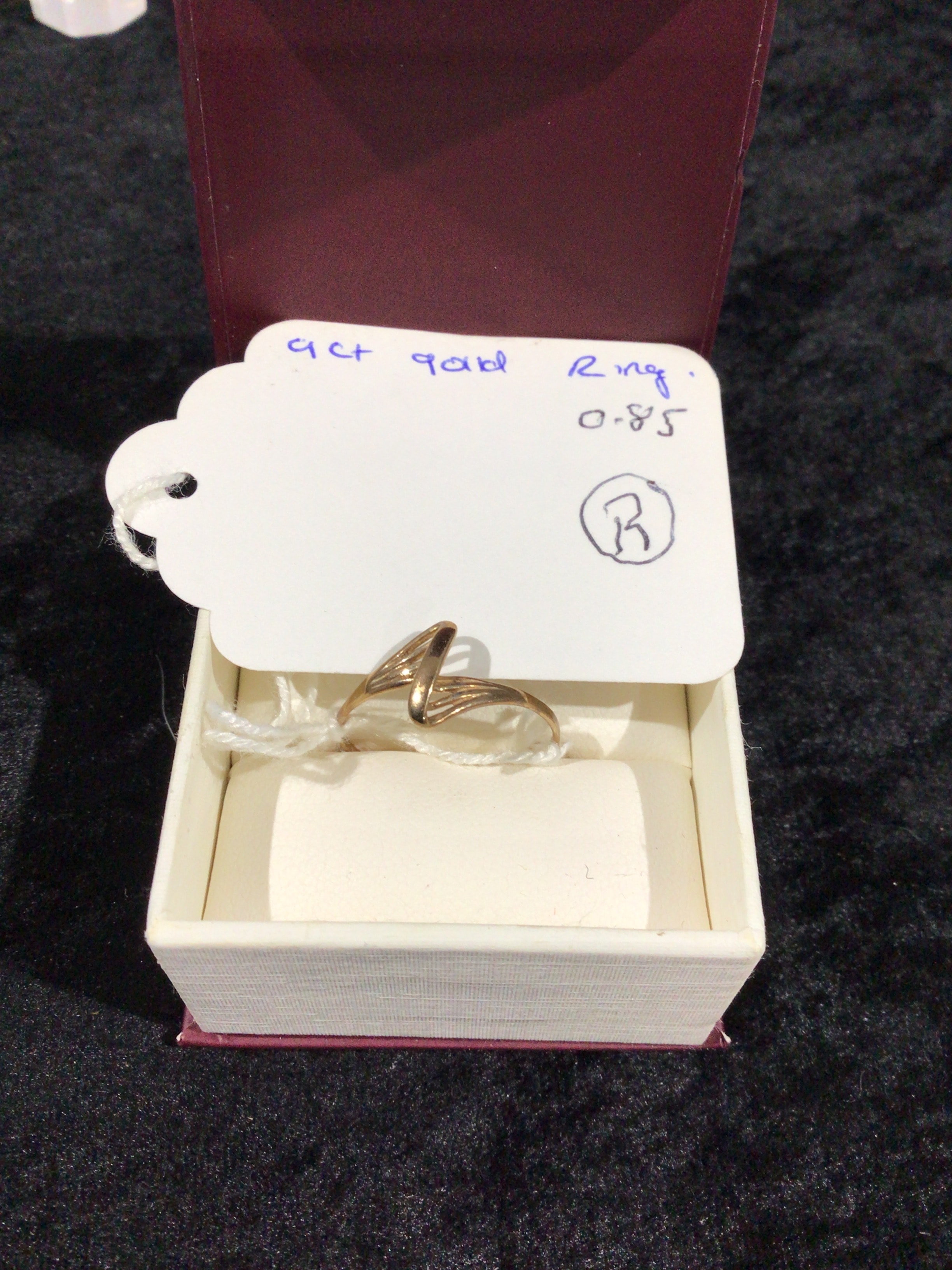 A gold-toned finger ring featuring an abstract bypass design with multiple slender bands forming an openwork element across the top. The ring is presented in a small, rectangular, off-white presentation box with a hinged maroon lid. A white, scalloped-edge tag is tied to the ring with white string, bearing handwritten blue ink that reads “9 ct gold Ring”, “0.85”, and a circled “R” mark.