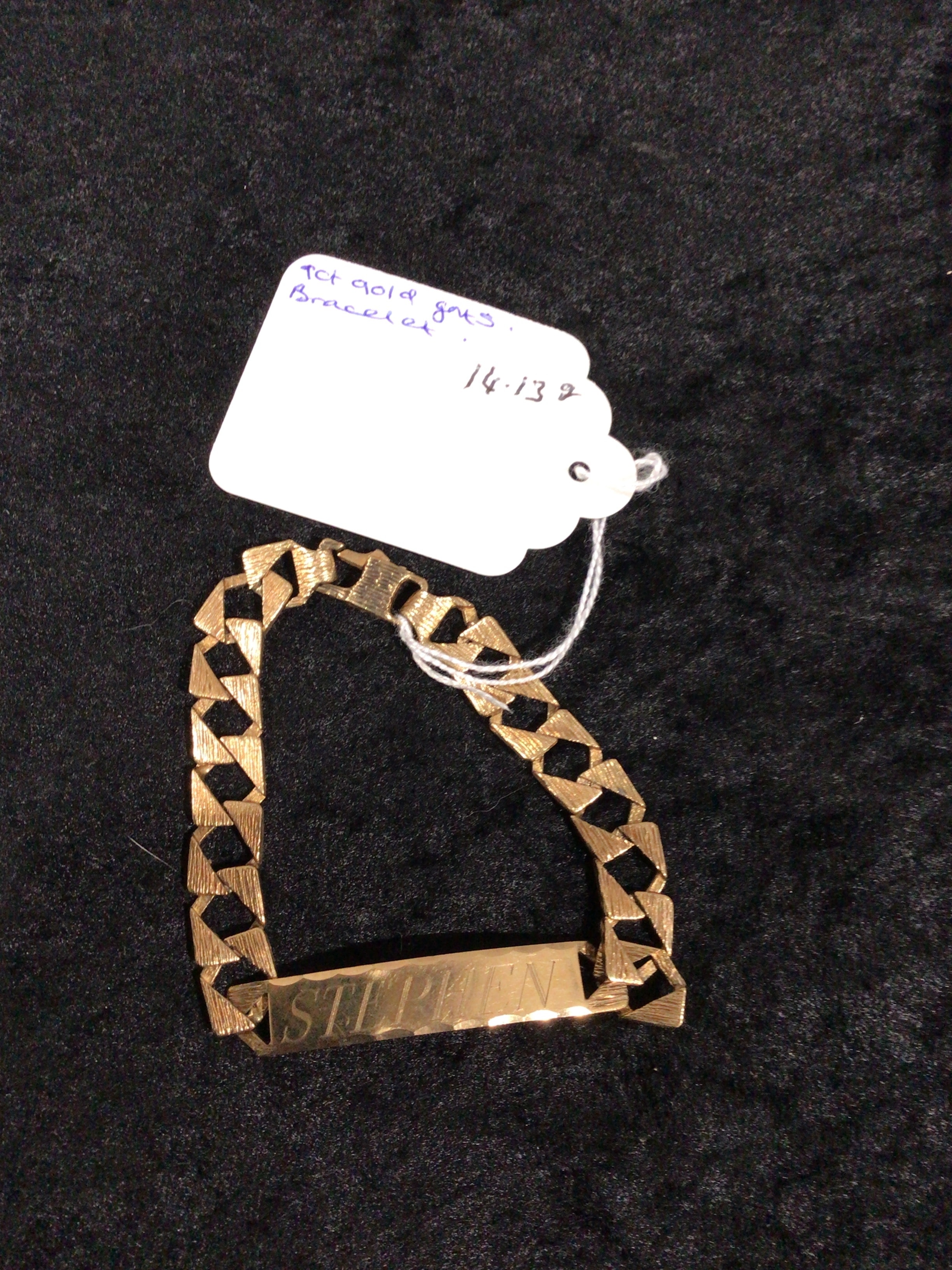 A yellow metal identification bracelet, described on the accompanying tag as ‘9ct gold guss.’, featuring a textured curb-link chain and a central rectangular plate. The plate is engraved with the name ‘STEPHEN’ in capital letters. Bearing inventory number 14.139.