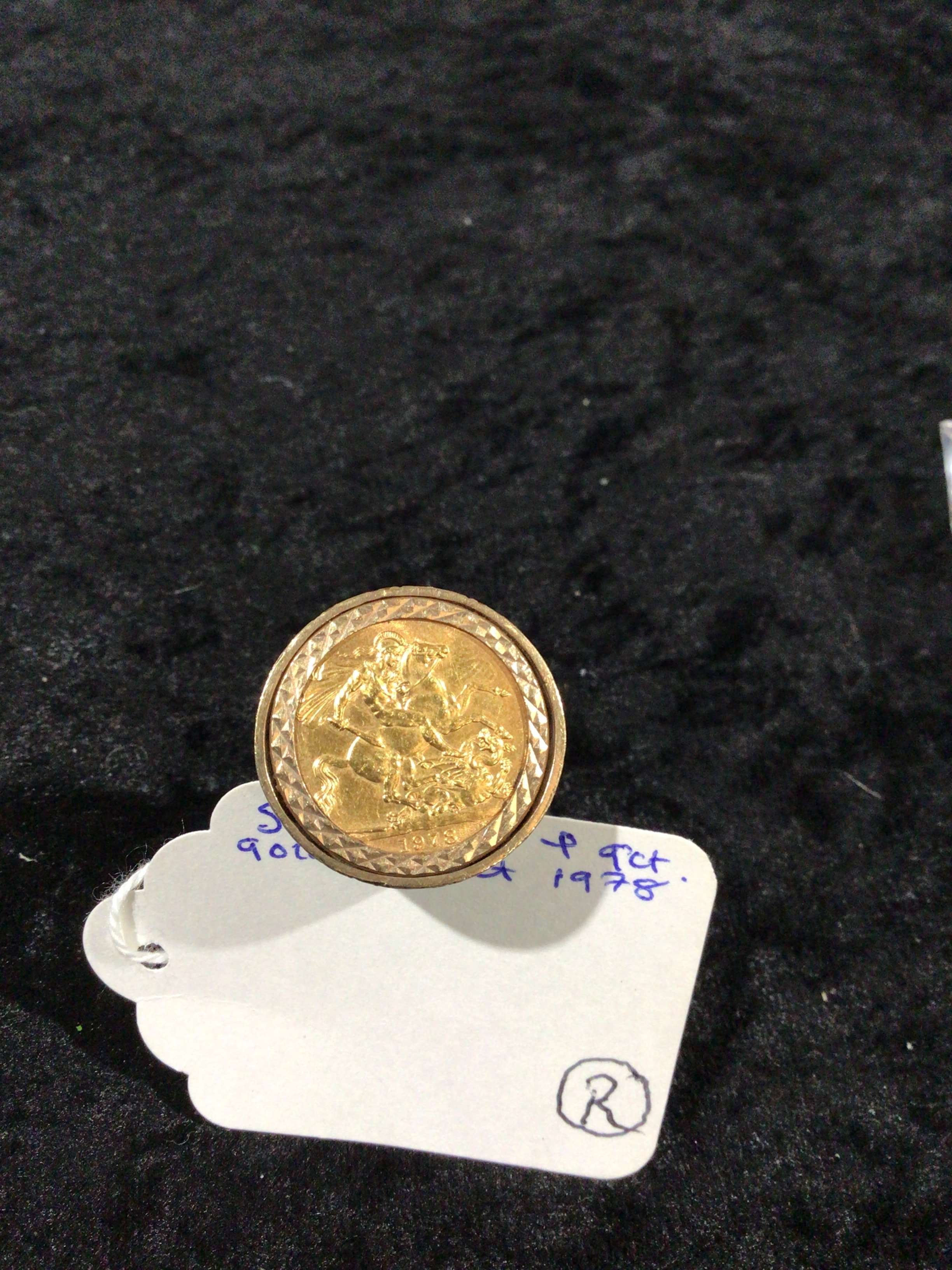 The item is identified as a 9ct Gold British Full Sovereign Coin Ring. It features a 22ct gold British sovereign coin, minted in 1978, depicting Saint George slaying the dragon. The coin is securely set within a 9ct gold bezel, which exhibits a machine-engraved zig-zag pattern. The item was presented on a white, scalloped-edge paper tag with handwritten blue ink notations ” 1978″, and a circled “R”. 15.58 gram
