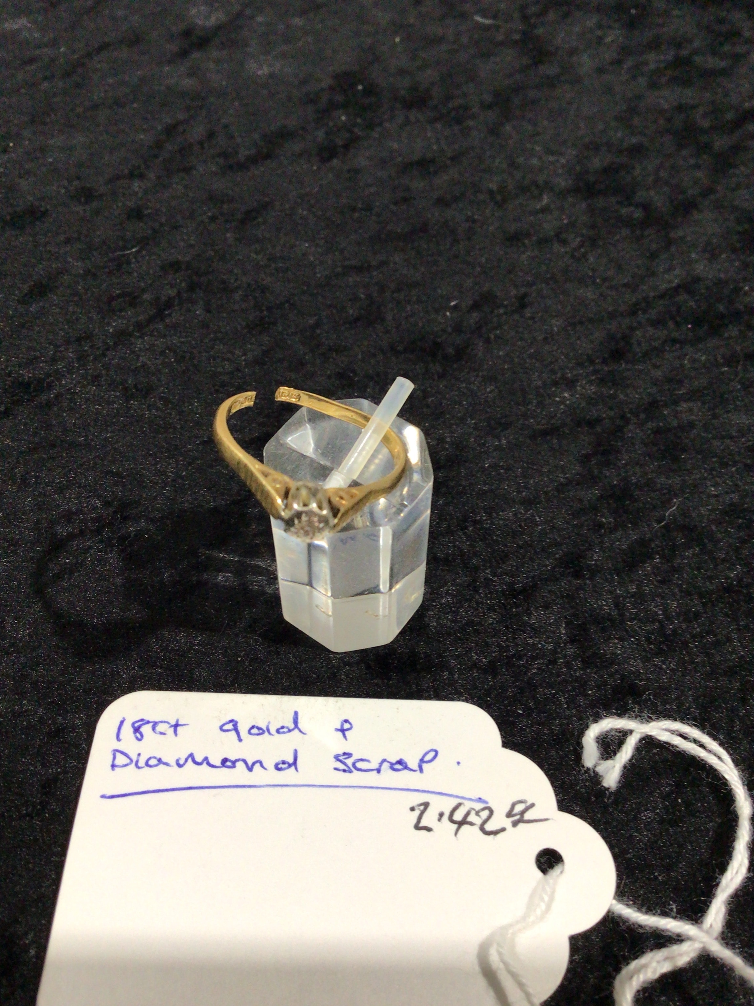An 18ct gold finger ring, featuring a central round brilliant-cut diamond set in a six-prong solitaire mounting. A partial ’18CT’ hallmark is faintly visible on the exterior of the band. The accompanying handwritten tag designates the item as “18ct gold & Diamond scrap.”
