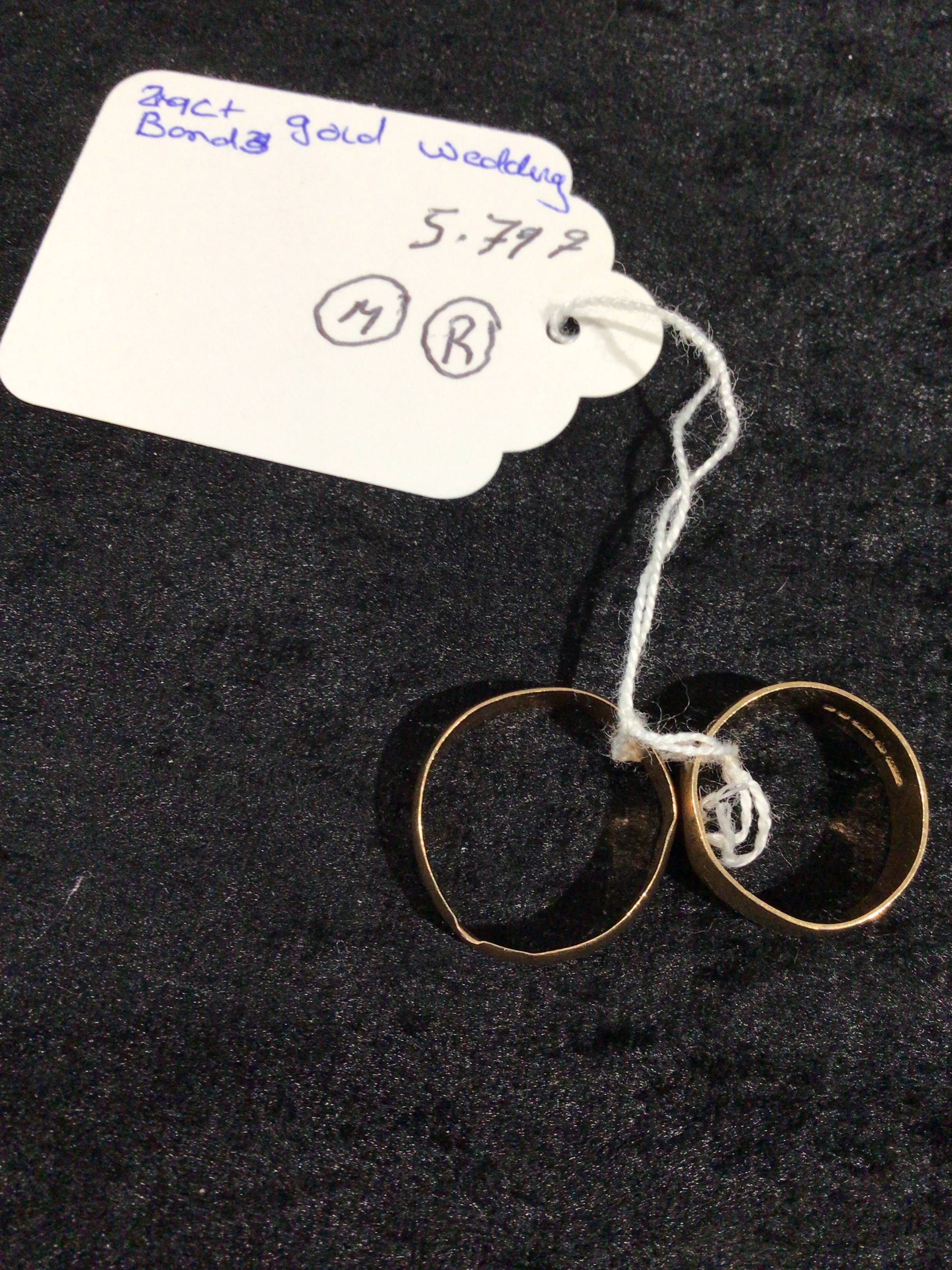 A pair of plain band rings, crafted from 9ct gold , identified by an attached tag as 9ct gold wedding rings. The rings display polished surfaces. Indistinct hallmarks are visible on the interior surface of one ring. The rings exhibit minor surface wear consistent with use.