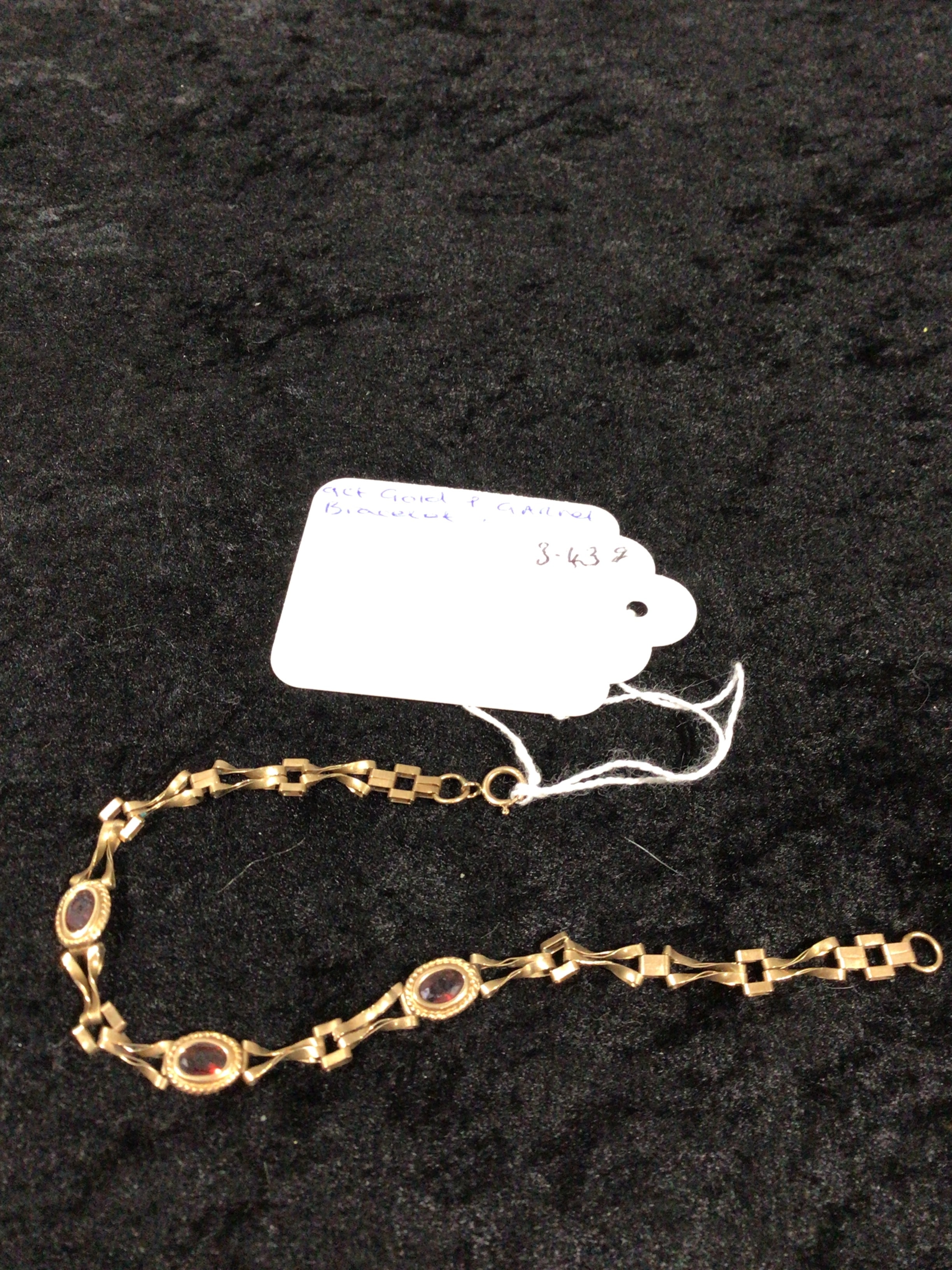 A 9ct gold and garnet link bracelet. It features a series of interconnected gold-toned links, some appearing as rectangular segments and others as twisted or figure-eight shapes. Integrated into the design are three oval, bezel-set dark red stones, consistent with garnets, each framed by fine milgrain detailing. The bracelet secures with a spring ring clasp. Inventory number 3-439.