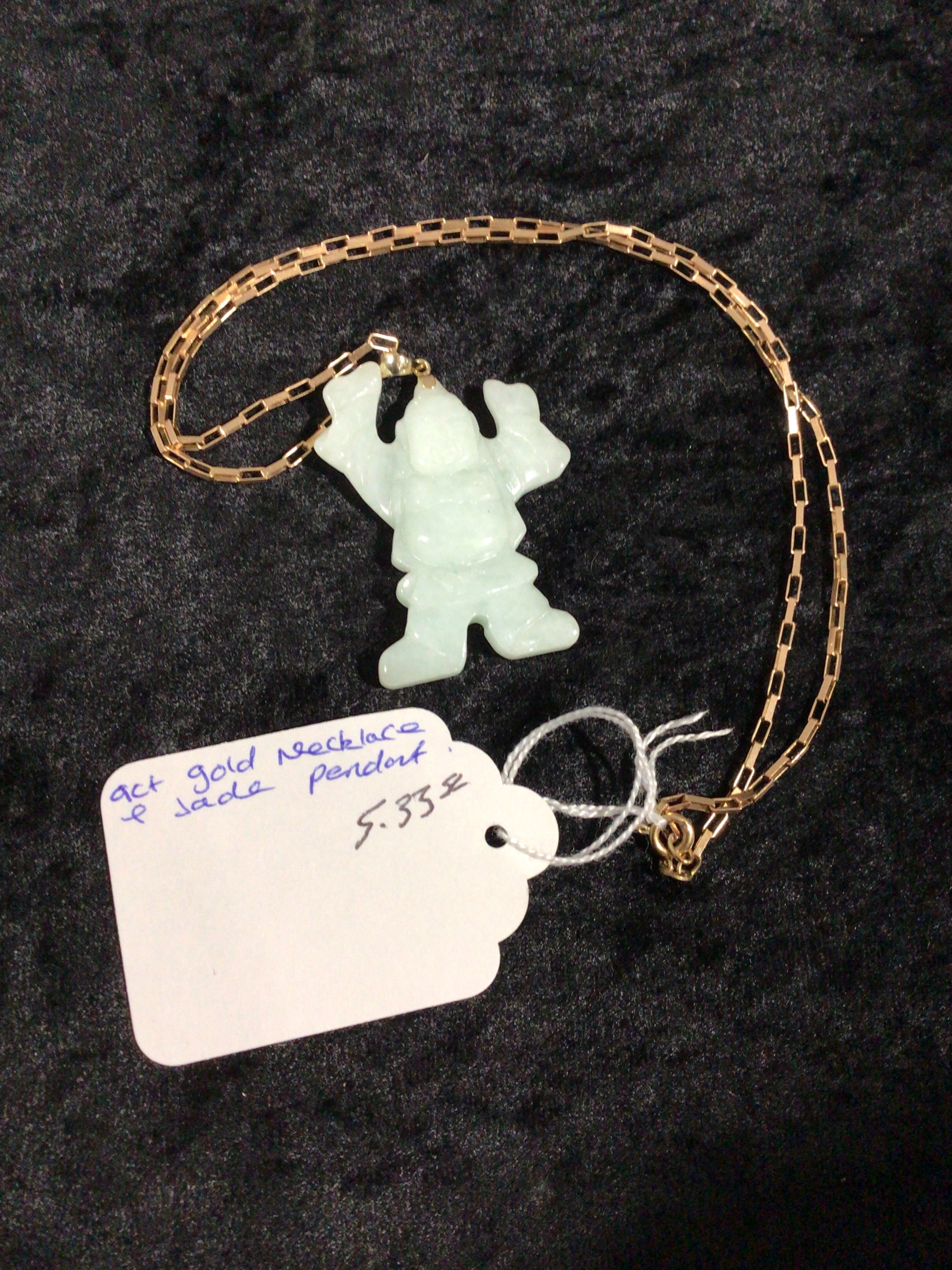 A necklace featuring a 9ct gold-toned chain with rectangular, paperclip-style links. Suspended from the chain is a light green, translucent carved jade pendant, depicting a stylized human-like figure with arms raised. An accompanying white, scalloped-edge tag bears handwritten blue ink stating “9ct gold necklace & jade pendort” and a price of “5.33£”.