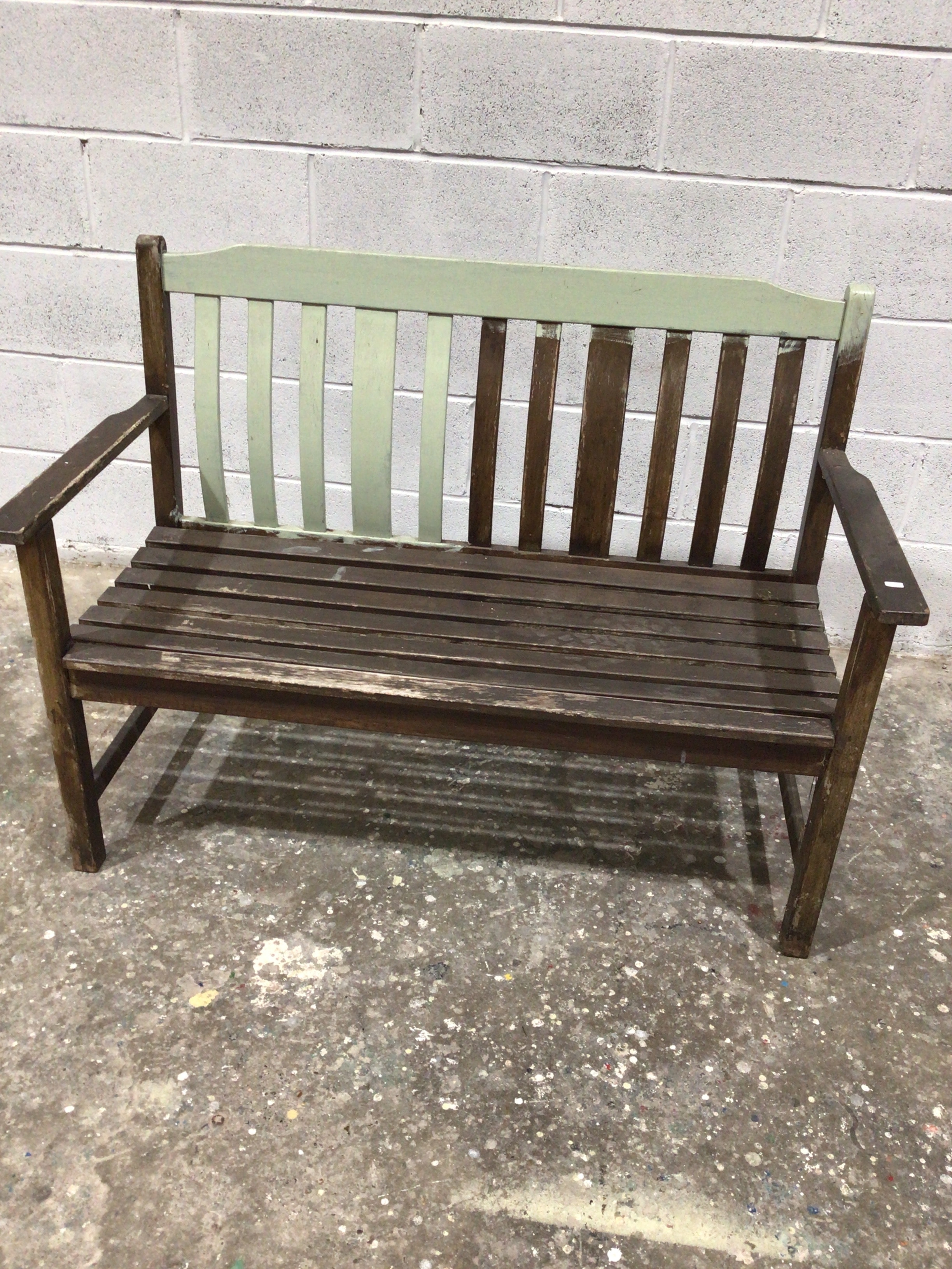 A Weathered Timber Two-Seater Garden Bench with Painted Backrest