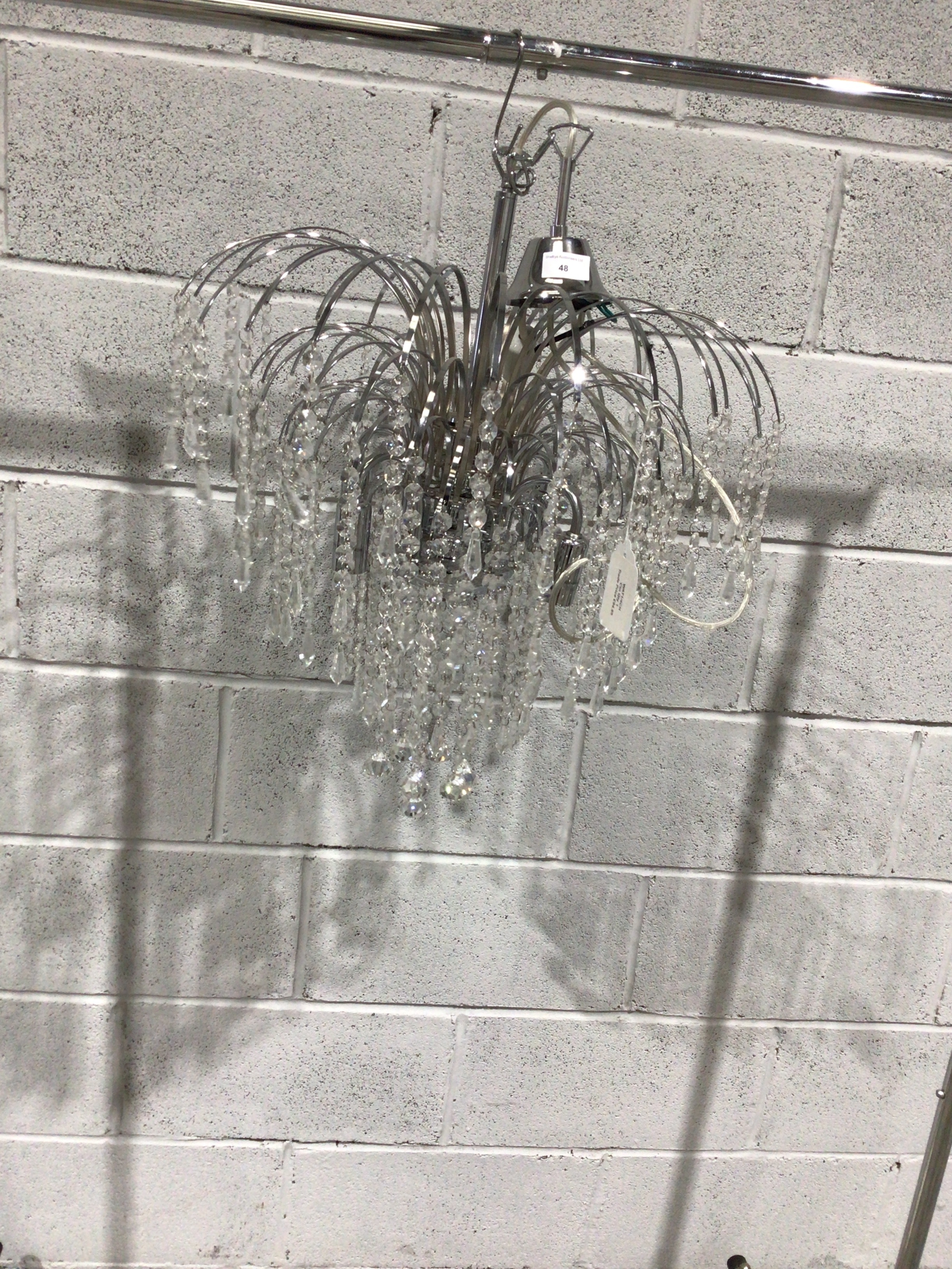 A modern multi-arm ceiling light fixture, identified as a Searchlight Waterfall Chandelier. It is constructed from polished silver-tone metal, likely chrome or stainless steel, with numerous clear, faceted acrylic or glass crystals cascading from multiple arched arms. The design presents a contemporary interpretation of a traditional chandelier. A white label on the canopy displays ’48’, while an attached tag identifies the seller as ‘Shadys Auctions Ltd’ and notes ‘Item description: MODERN CH…’.