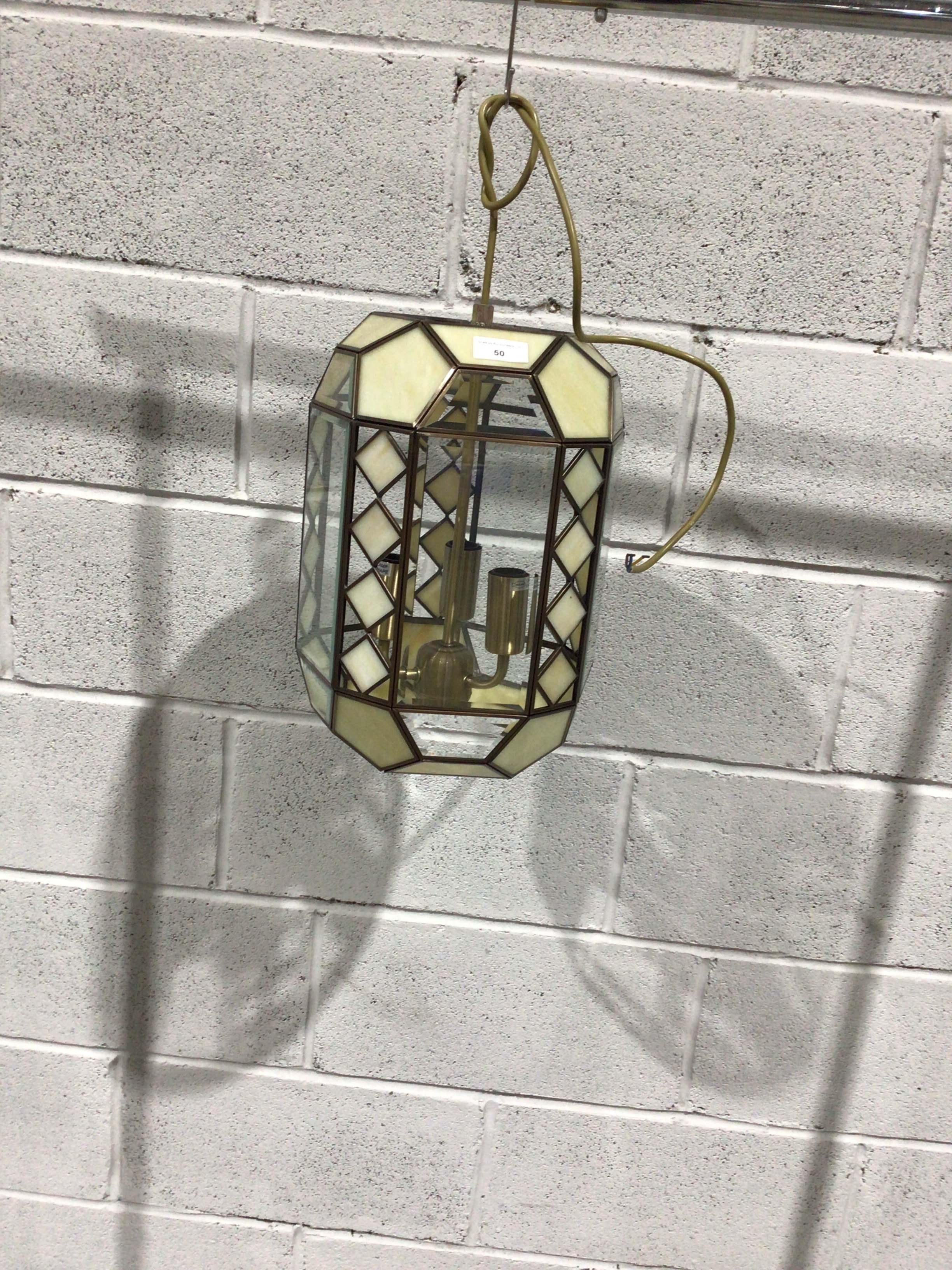 A vintage Tiffany style stained slag glass pendant light, dating from the mid to late 20th century. This multi-faceted fixture features a brass-toned metal frame enclosing numerous panels of clear and opaque cream-colored art glass, arranged in geometric patterns including diamond motifs on its sides. The interior is fitted with several brass-colored light bulb sockets, one bearing partial text ‘AMP’. It hangs from an olive-green electrical cord. A white auction label displaying the number ’50’ is affixed to one of the upper opaque panels.