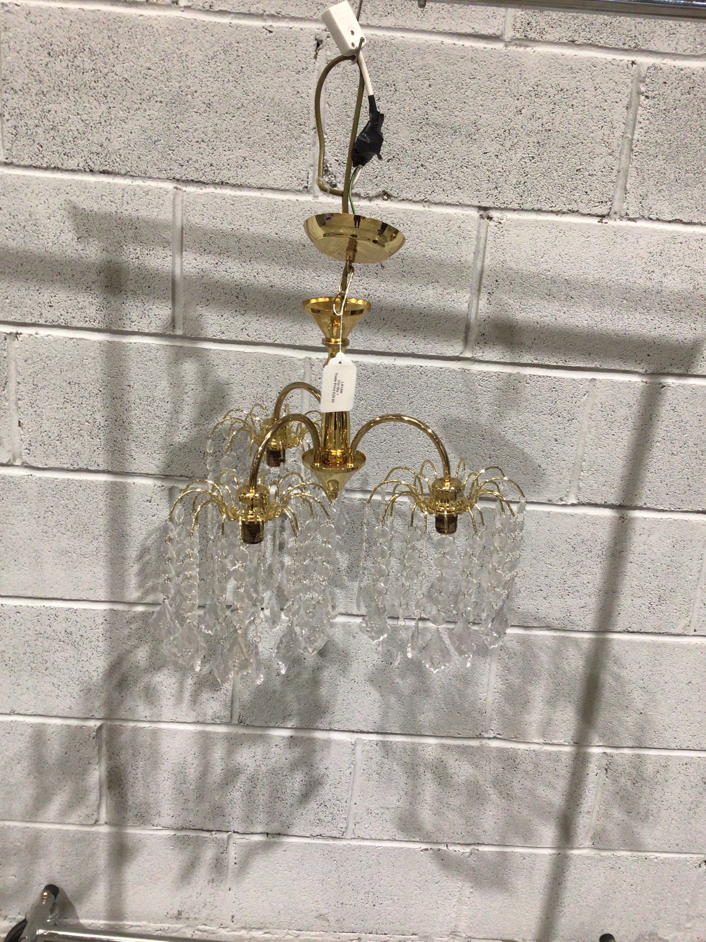 A Vintage 1960s Small Brass Chandelier. This three-arm ceiling light fixture is constructed from a gilded or brass-tone metal frame. Its decorative style features curved arms supporting clear, faceted crystal or acrylic drops, suspended from golden wire frameworks. A white retail tag is attached, reading “LIGHT”, “230V”, “GLORIA”, and “TRADE PRICE 9.99”.