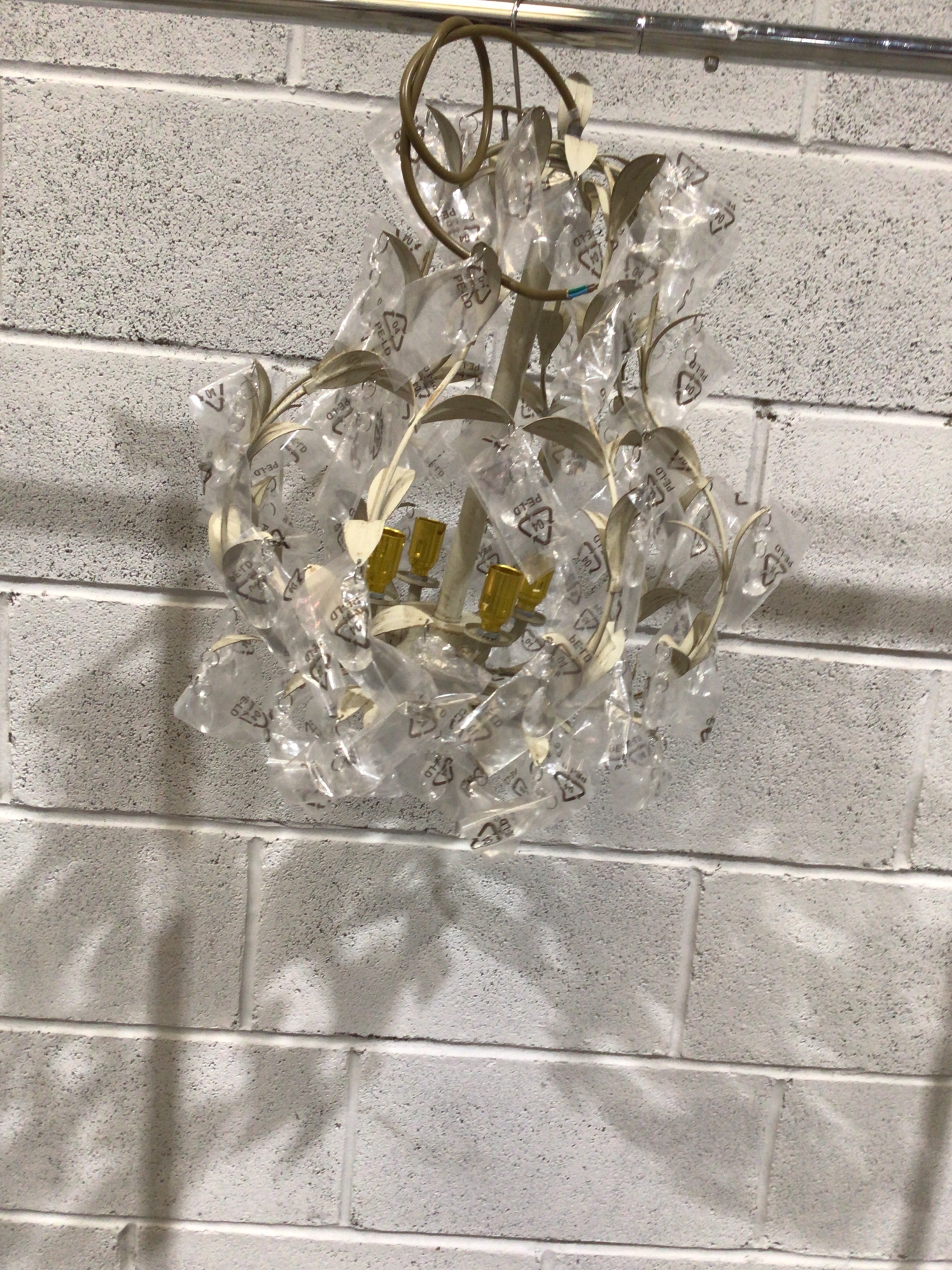 A decorative chandelier featuring a central painted metal stem in an off-white or cream hue. Multiple curved arms extend from the stem, adorned with numerous foliate or leaf-shaped elements. Several brass-toned bulb sockets are visible around the lower portion. The individual decorative components, including the glass drops, are largely encased in clear low-density polyethylene plastic bags, many displaying the “PE-LD” marking and associated recycling symbol (triangle with “04” inside). The visible electrical wiring appears intact.