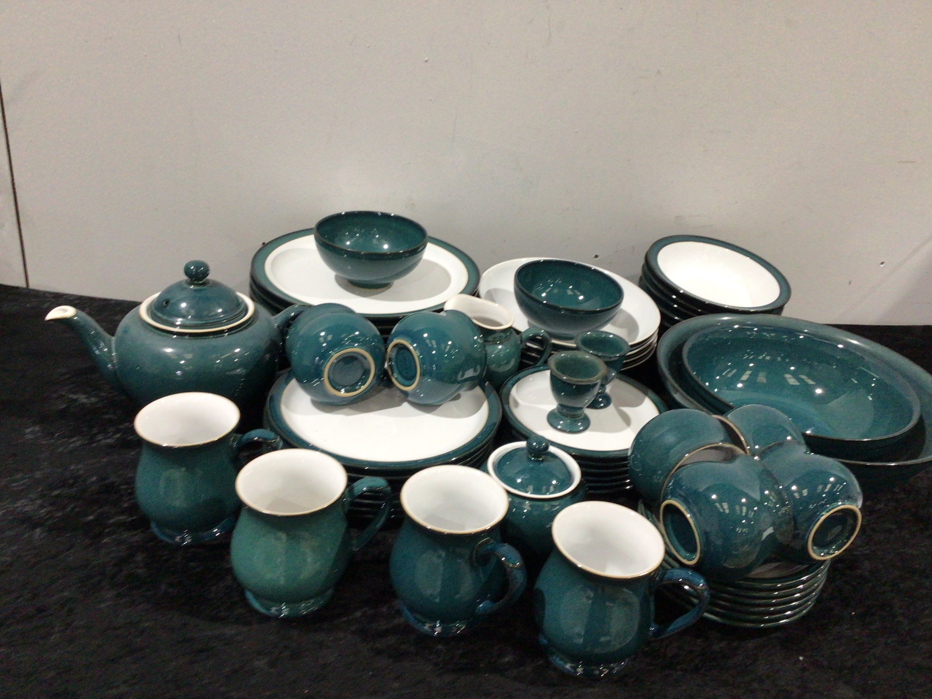 A large collection of Denby ‘Greenwich’ glazed stoneware dinnerware and serving pieces. Predominantly in a dark teal-green color, with many pieces featuring white interiors and plate undersides. The assortment includes dinner plates, salad plates, bowls, various mugs and cups, a teapot, and additional serving dishes. Visible markings on the base of several pieces identify the maker as “Denby” and specify “STONEWARE,” along with care instructions such as “Dishwasher Safe,” “Freezer Safe,” “Microwave Safe,” “Oven Safe,” and “ENGLAND.” The style is contemporary.