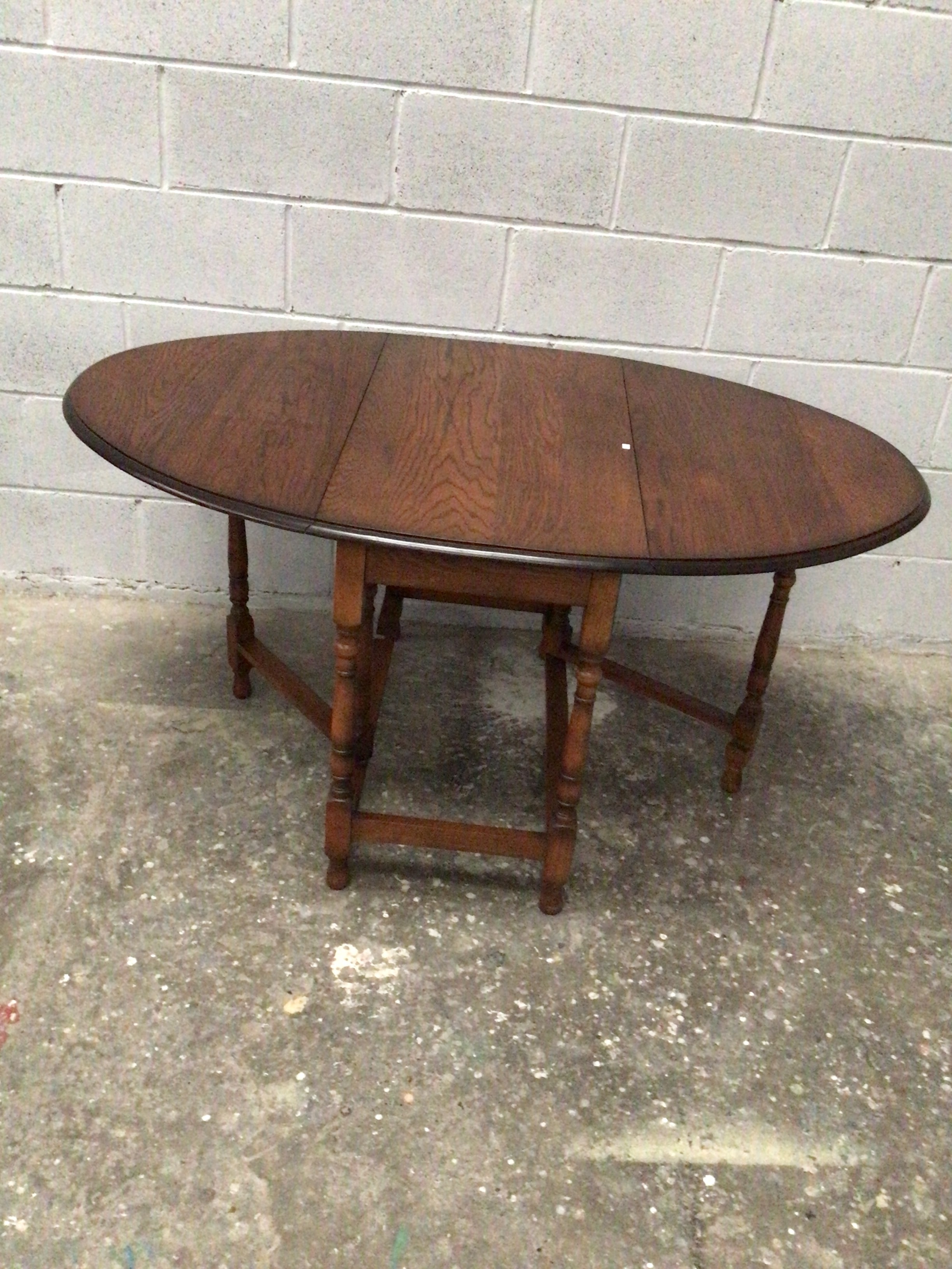 An English Jacobean Revival gateleg drop-leaf table, likely constructed from oak or a similar hardwood with a dark, rich stain. This traditional-style table features a central rectangular section and two hinged leaves, which, when extended, create an oval tabletop. The leaves are supported by turned gate legs connected by stretchers. When both leaves are dropped, the table takes on a compact, rectangular form. The design suggests a period between the late 19th and mid-20th century.
