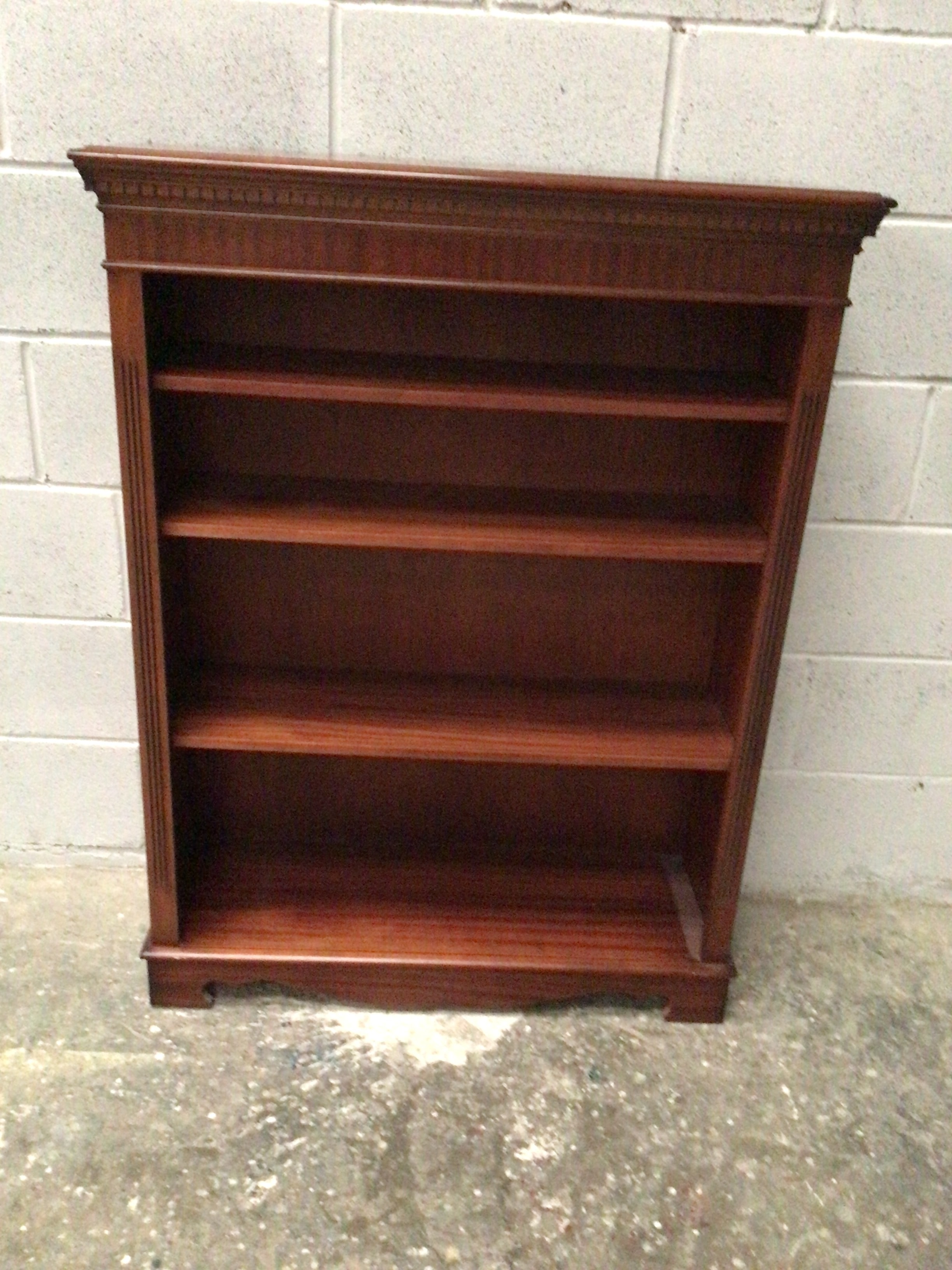 A Regency style open bookcase, crafted from dark-stained hardwood, likely mahogany, with a polished finish. The design features a molded cornice adorned with a repetitive block pattern, fluted pilasters on either side, and a shaped plinth base. The unit offers five open storage compartments formed by four fixed shelves.