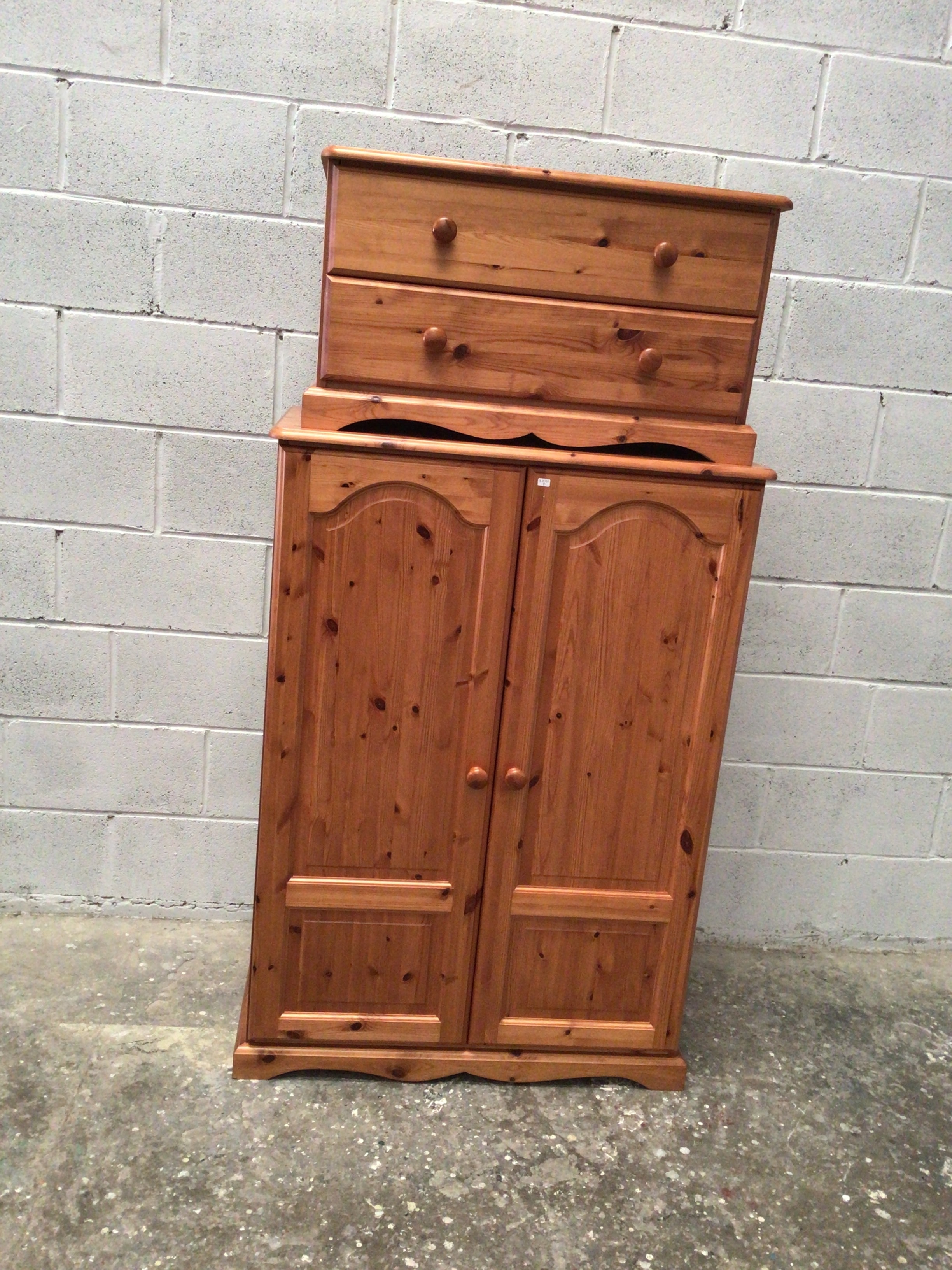 A two-piece, contemporary rustic-style wooden furniture unit, likely constructed from pine or a similar softwood with a warm, honey-toned stain. The lower section functions as a wardrobe or armoire, featuring two hinged doors with rounded arch panel details and turned wooden knobs. The interior is fitted with a metal hanging rail and a single fixed shelf. Stacked on top is a separate chest of drawers with two drawers, each fitted with a turned wooden knob. A white label with handwritten numbers, including “80,” is affixed to the right wardrobe door.