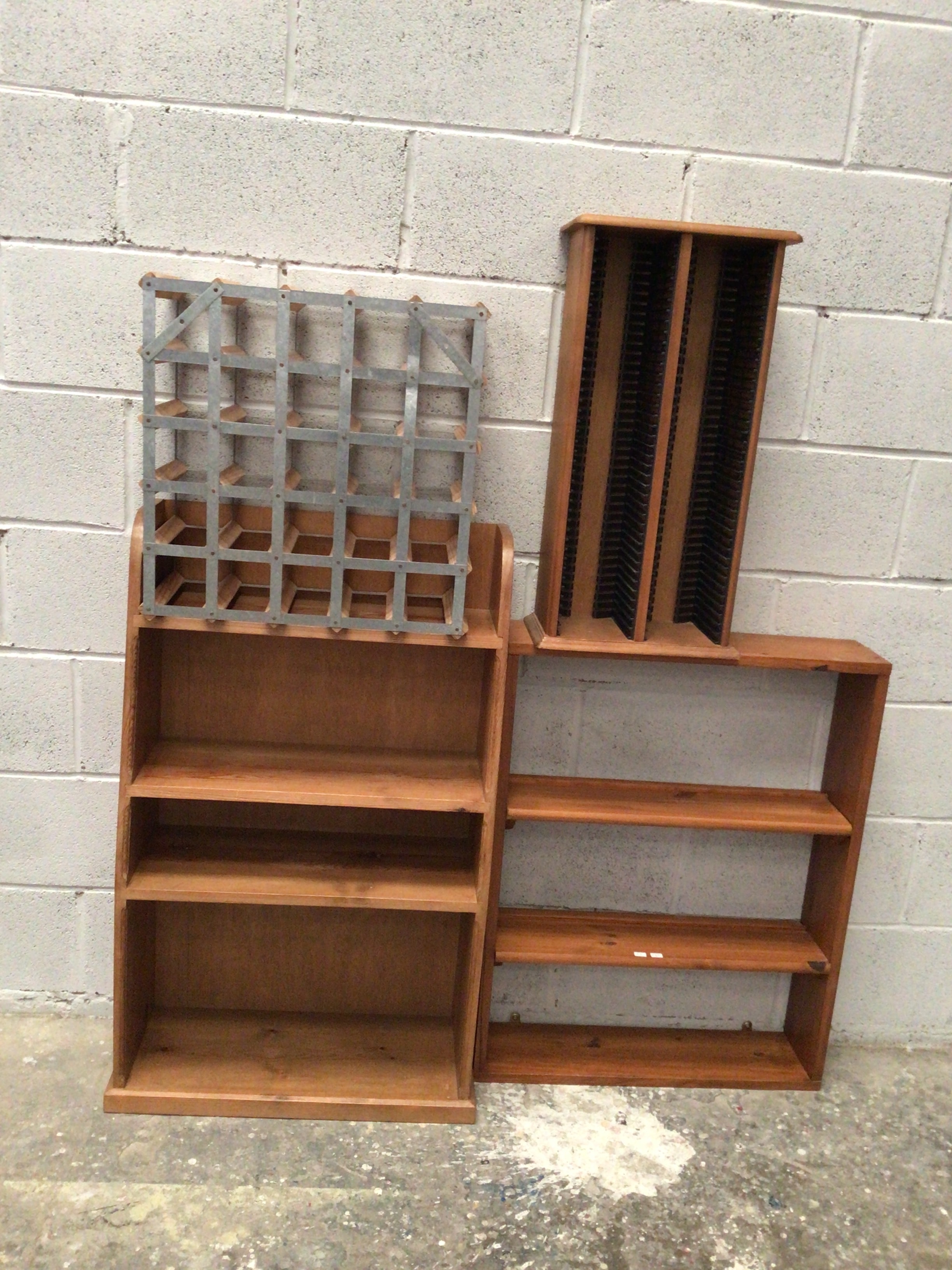 A group of four utilitarian storage items, likely dating from the mid-to-late 20th century, all exhibiting a simple, functional aesthetic. The collection includes two open shelving units of varying sizes, constructed from a medium-toned wood. Also present is a tall, narrow wooden media storage unit featuring numerous vertical dividers, likely designed for compact discs or similar media. The final item is a modular grid-form wine rack, combining galvanized metal framing with angled wooden bottle supports, which is currently resting on one of the wooden shelving units.