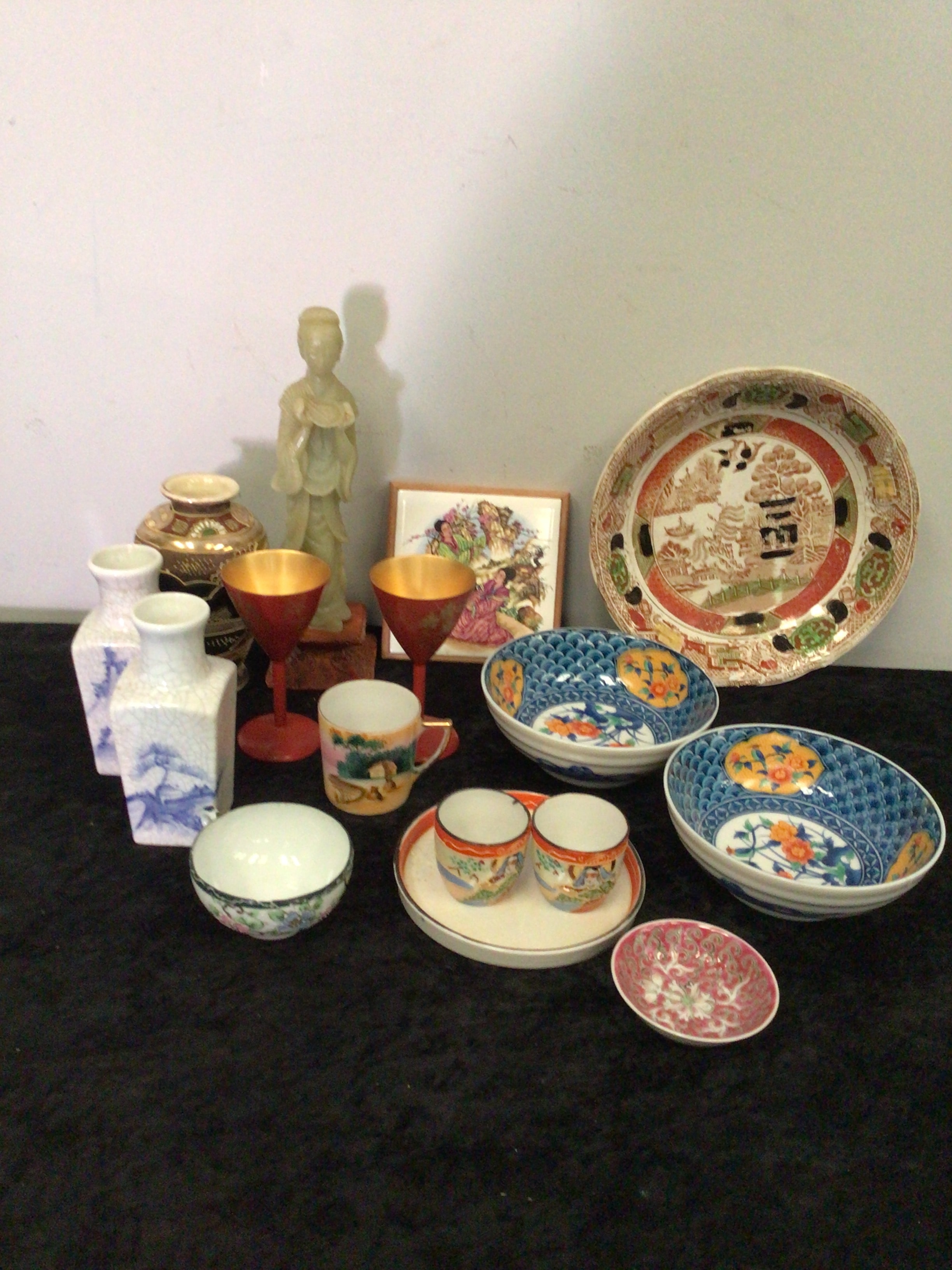 A collection of East Asian decorative arts, predominantly ceramics, comprising: A pair of square crackle-glazed white porcelain vases with blue underglaze landscape decoration; a small gilt and polychrome-enameled lidded jar; a ceramic mug with a landscape scene; a pair of red-stemmed metal goblets with gilt bowls; a carved pale green figure, possibly stone or resin, depicting a standing female; a small framed print illustrating figures in traditional attire; a large circular plate in an Imari-style polychrome design featuring a central landscape with the visible characters ‘三百’ (sanbyaku, meaning ‘three hundred’); a pair of deep blue and white bowls adorned with floral and geometric patterns; a small white bowl with a floral rim; a small ceramic tray holding a pair of miniature cups with figural decoration; and a small pink and white dish with intricate foliate motifs.