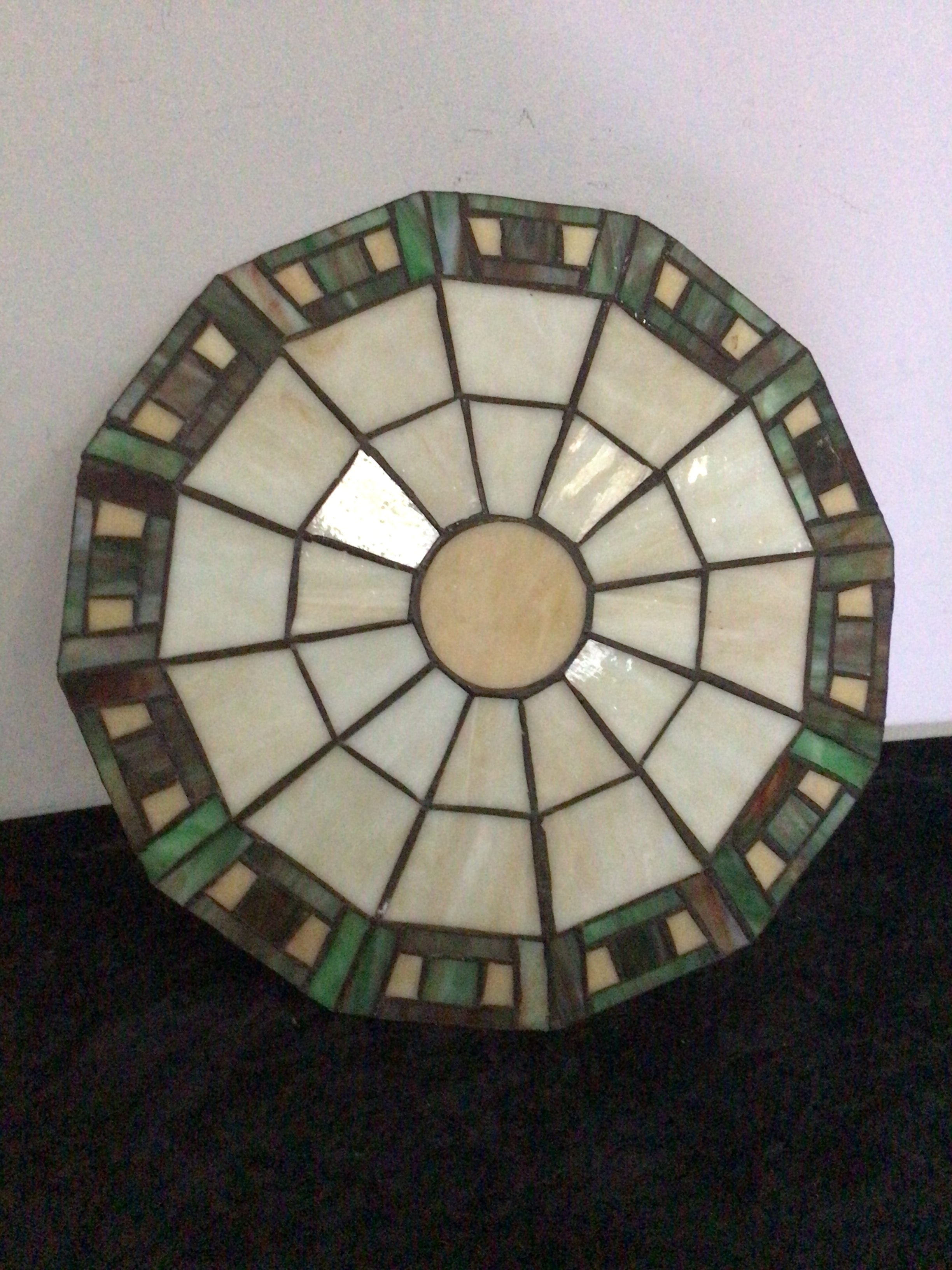 A Modern Tiffany Style Arts and Crafts leaded glass ceiling light shade. This octagonal fixture features a geometric pattern with a central amber-toned glass panel surrounded by radiating cream-colored panels. An outer border incorporates rectangular segments of dark brown, cream, and pale green opaque glass panels, all joined by lead came. The reverse side reveals a metal chain and a central mounting ring with a small, unreadable tag attached.