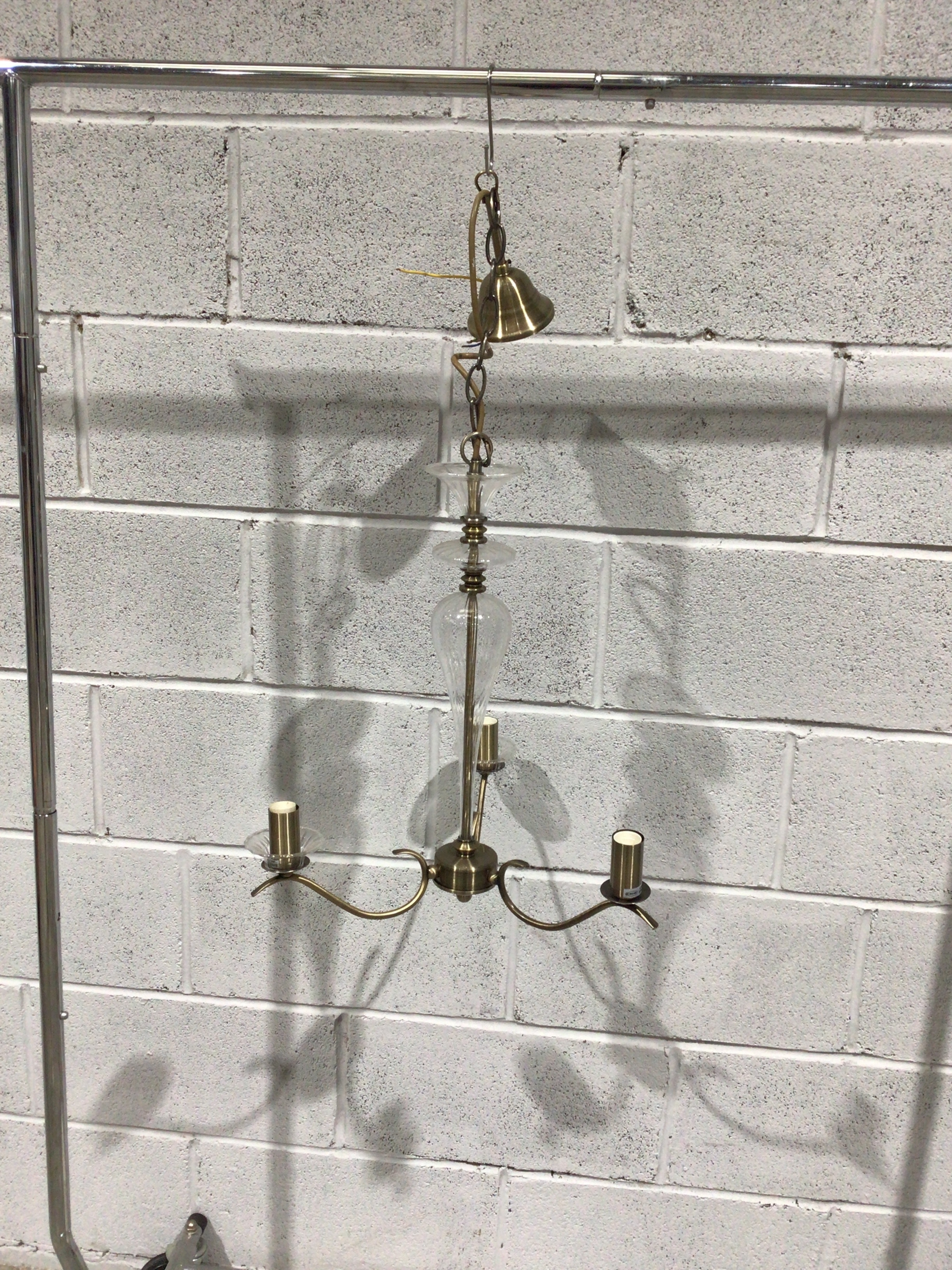 A Vintage Style Three-Light Chandelier, Brass-Toned Metal and Glass