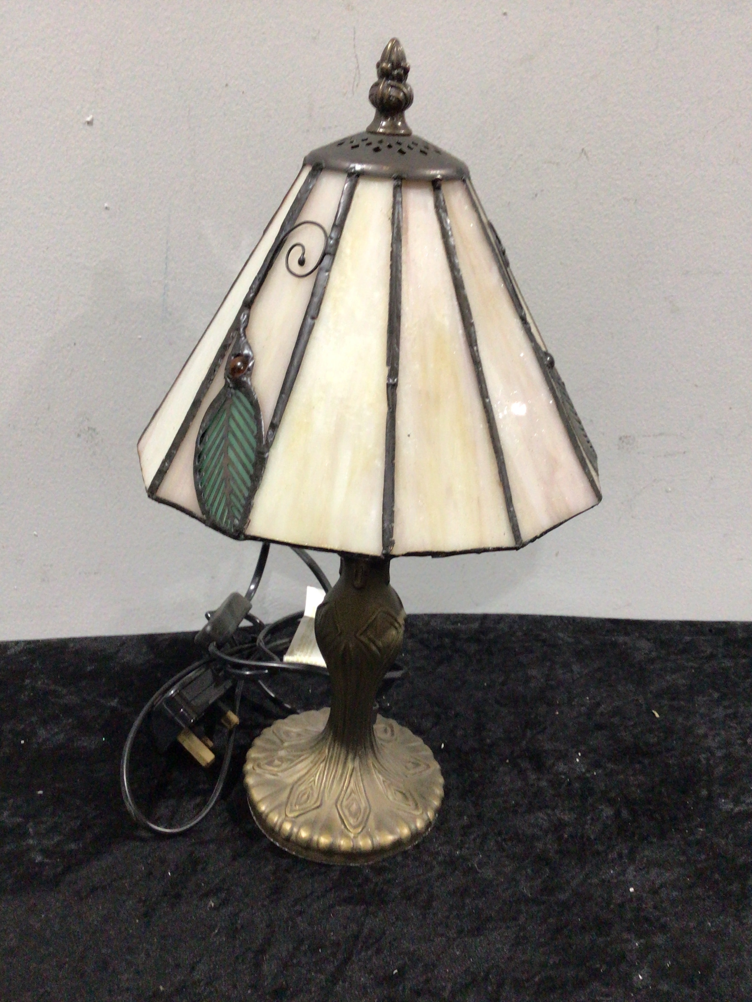 A Vintage Tiffany-style leaded stained glass table lamp. This lamp features a multi-faceted, tapering leaded stained glass shade, primarily composed of off-white or cream-colored panels, accented with a prominent green leaf motif and a dark metal scroll detail, all joined by dark solder lines. A decorative dark metal finial with ventilation holes tops the shade. The lamp stands on an ornate, brass or bronze-toned metal base, characterized by a fluted stem and a circular foot adorned with embossed foliate or organic patterns. The lamp is fitted with a black electrical cord and a UK-style plug.
