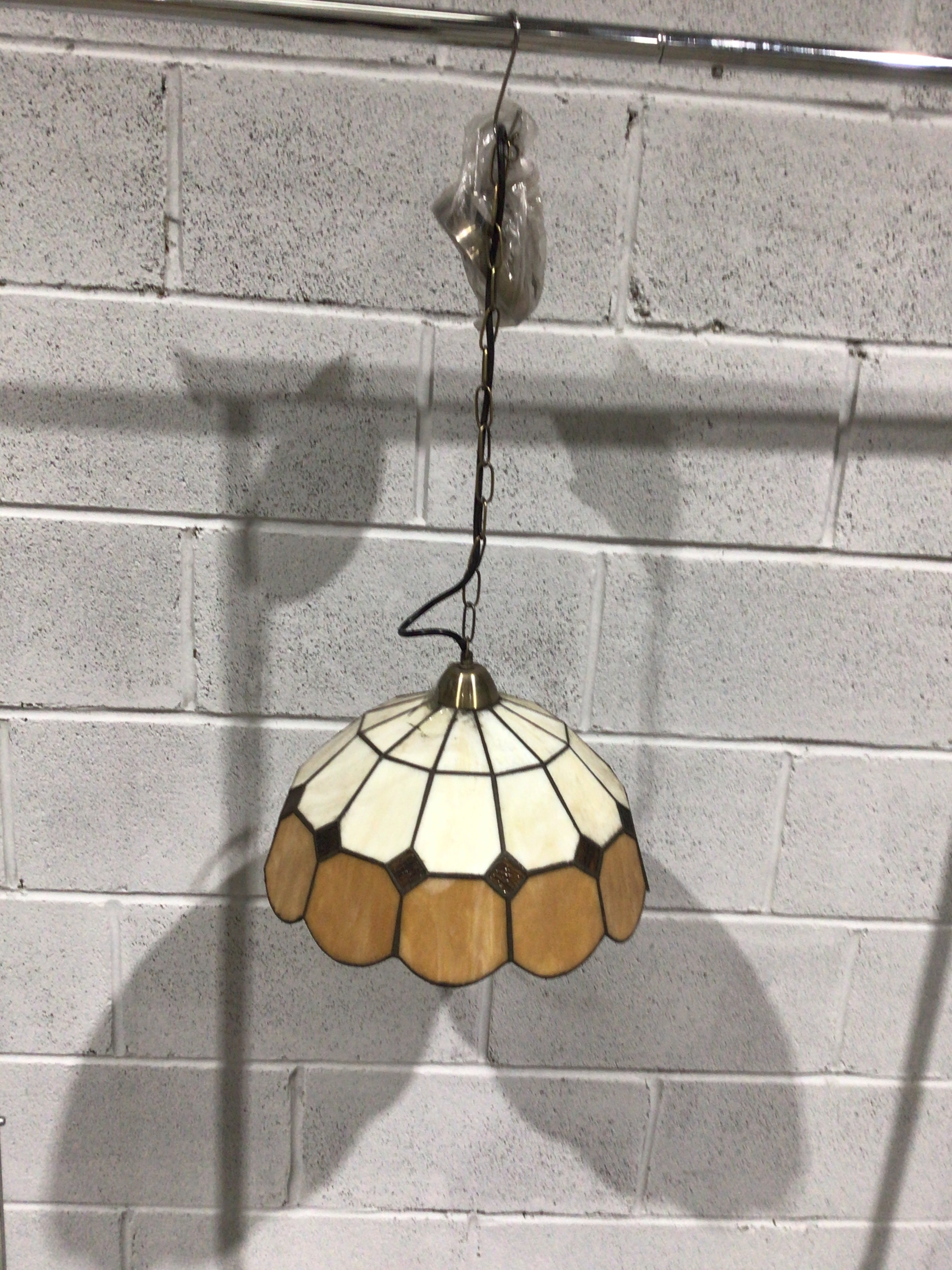 A Tiffany Style Slag Glass Hanging Pendant Light. This dome-shaped pendant light features a shade crafted from geometric stained glass panels in off-white/cream and translucent amber/light brown hues, joined by dark solder lines. It is suspended by a brass-toned metal chain. The aesthetic suggests an early 20th-century style or reproduction. The ceiling canopy is partially wrapped in protective plastic.